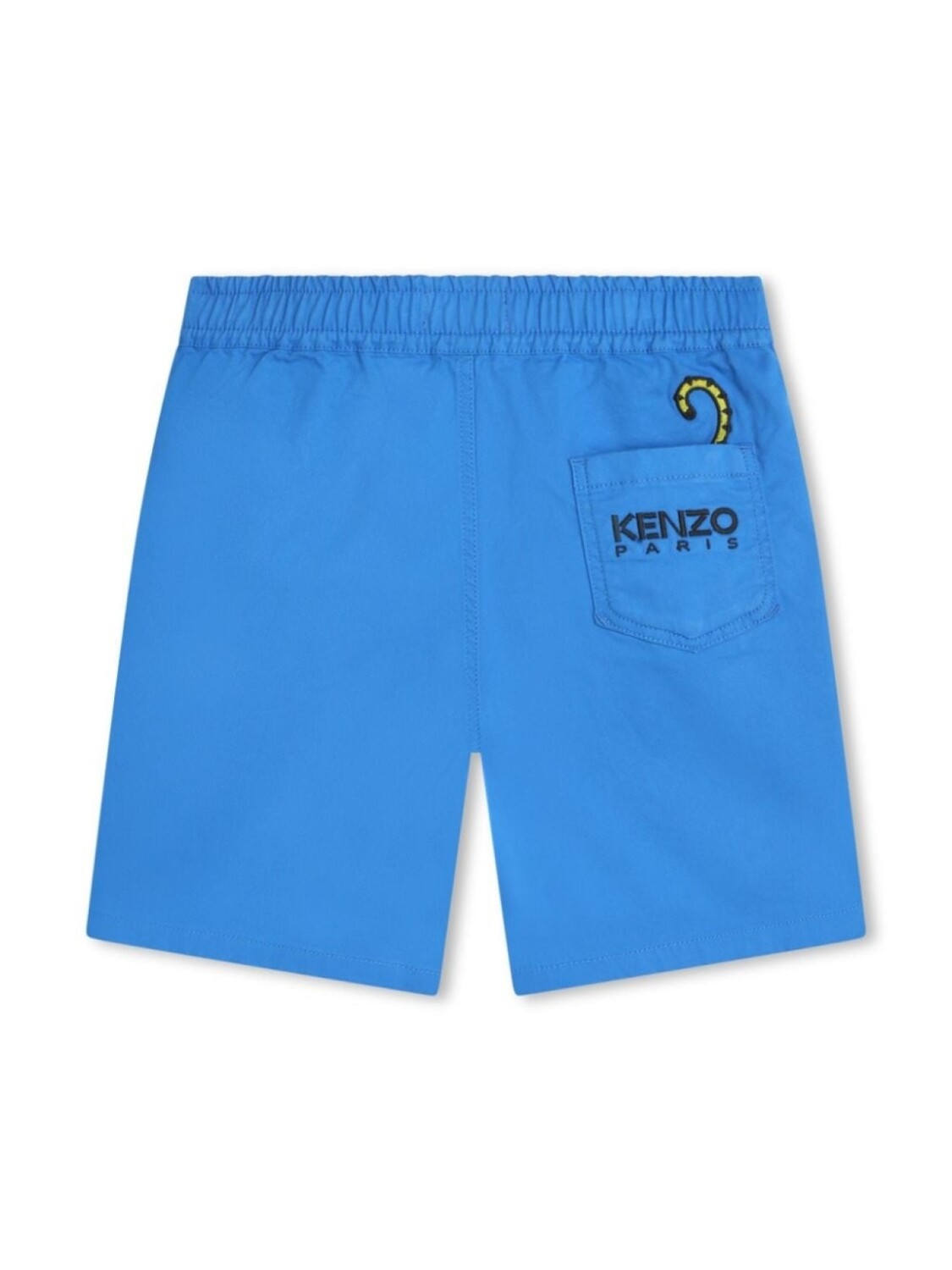 Насыщенно-синий, эластичный хлопок, вышитый логотип сзади, вышитый узор, кулиска на талии, два вшитых кармана по бокам, накладной карман сзади, прямой подол и длина до бедер.