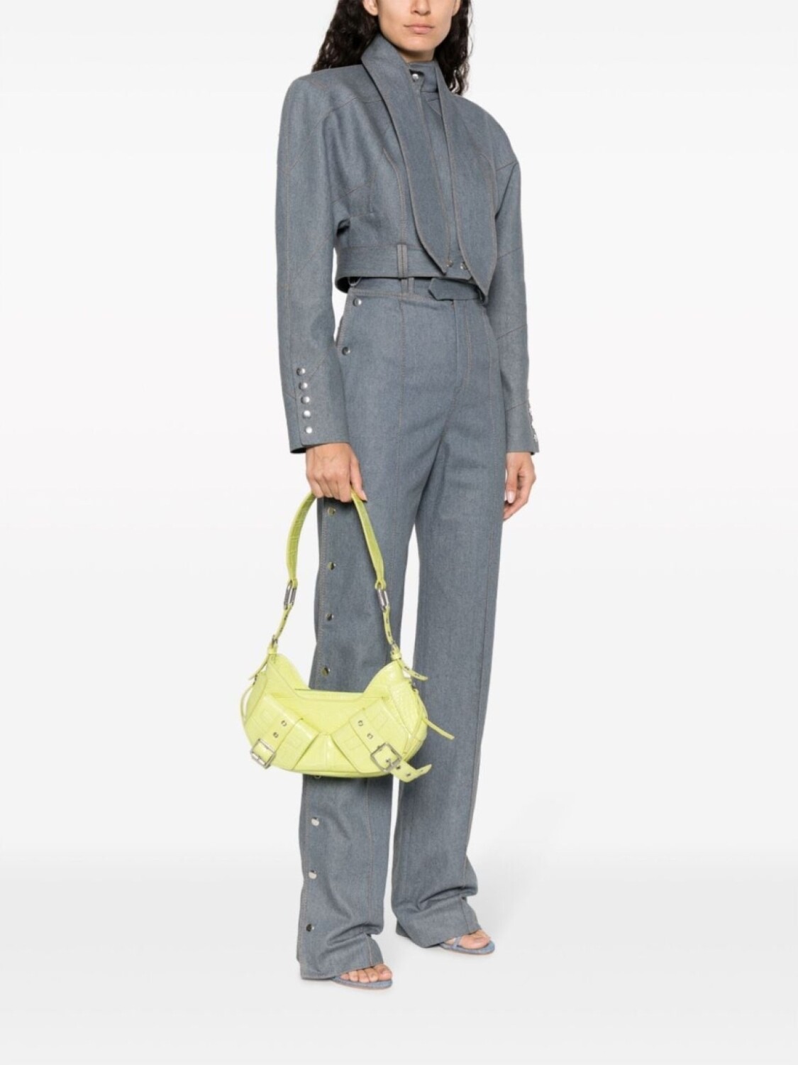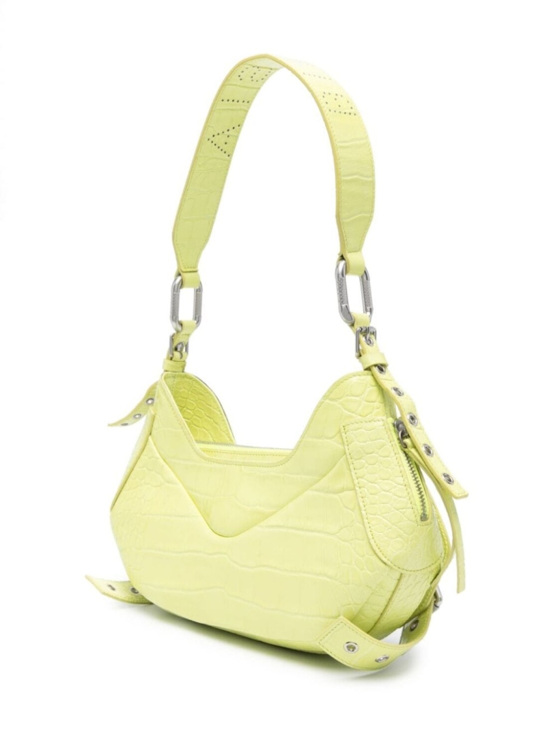 Неоново-зеленый, хлопок/кожа, нашивка с логотипом внутри, серебристая фурнитура, перфорация, застежка на молнии сверху, застежка на пряжке, регулируемый ремень на плечо, два передних кармана с клапанами и основное отделение.