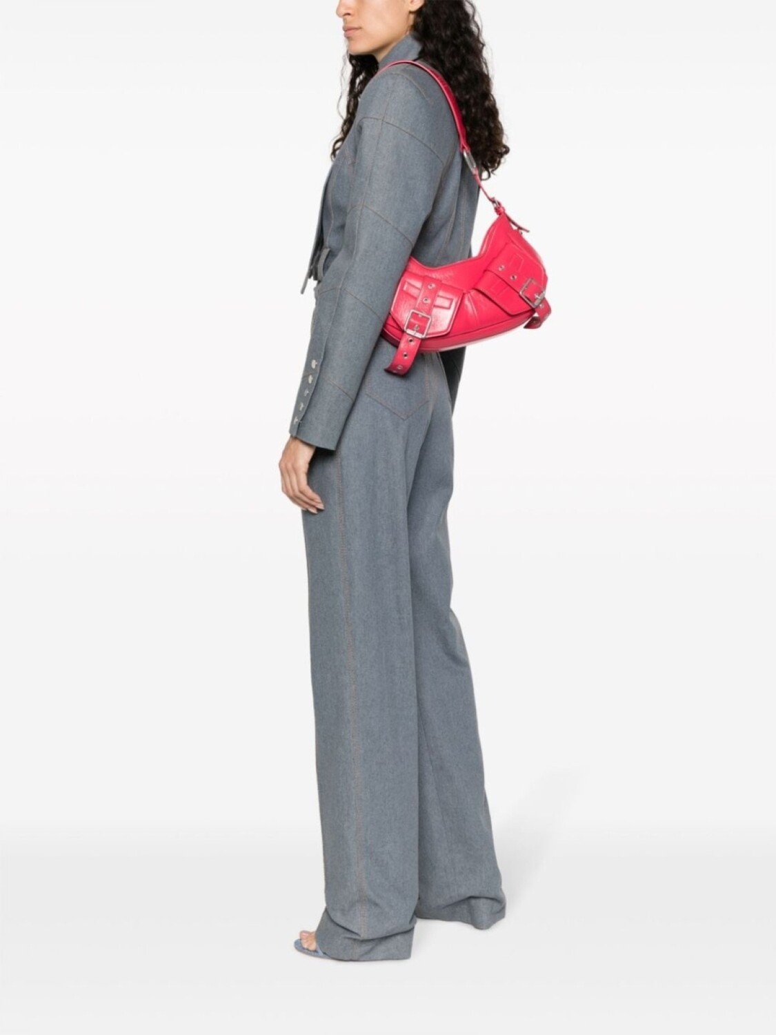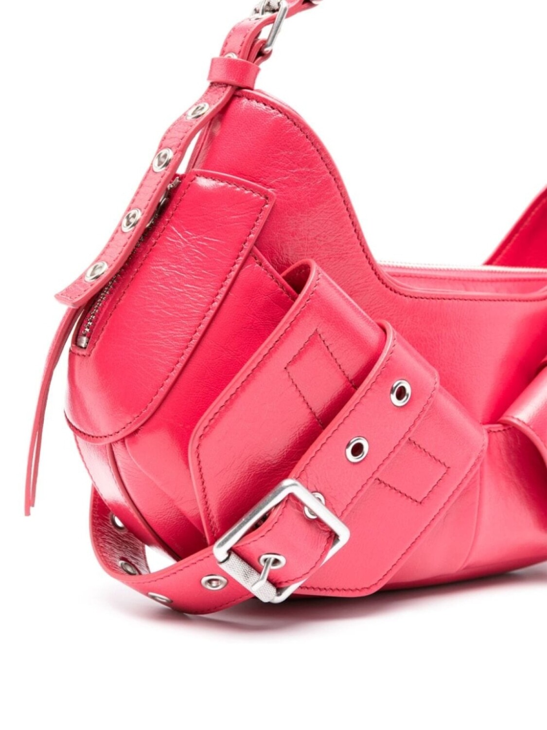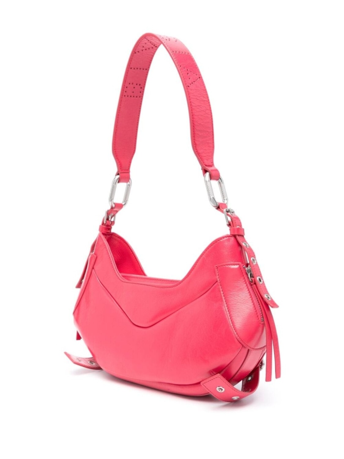 Фуксия, телячья кожа, нашивка с логотипом внутри, серебристая фурнитура, перфорация, застежка на молнии сверху, застежка на пряжке, регулируемый ремень на плечо, два передних кармана с клапанами и основное отделение.