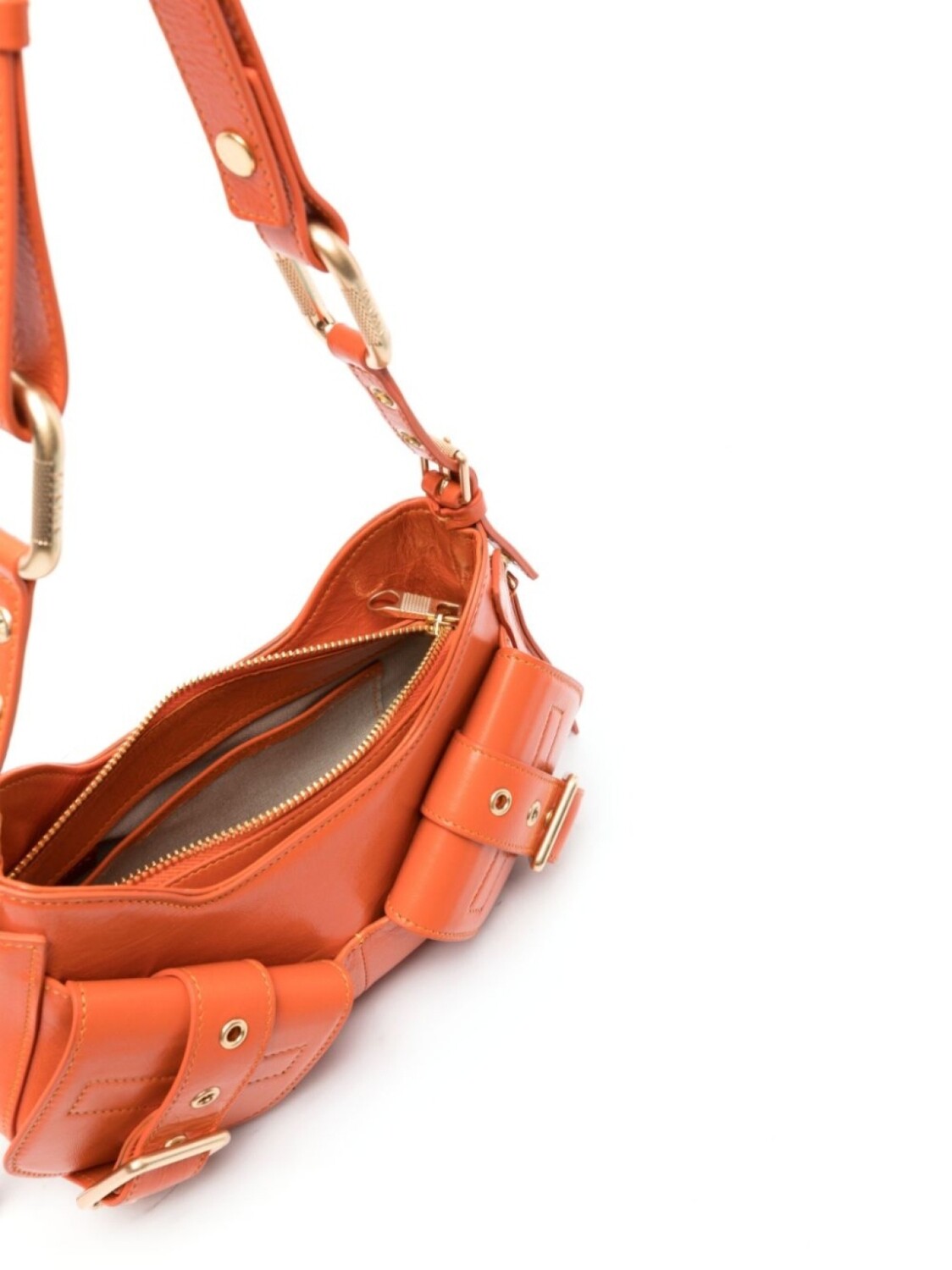 Морковный, кожа, золотистая фурнитура, декоративные пряжки, съемный регулируемый ремень на плечо, застежка на молнии сверху, основное отделение, внутренний прорезной карман и два передних кармана с клапанами.