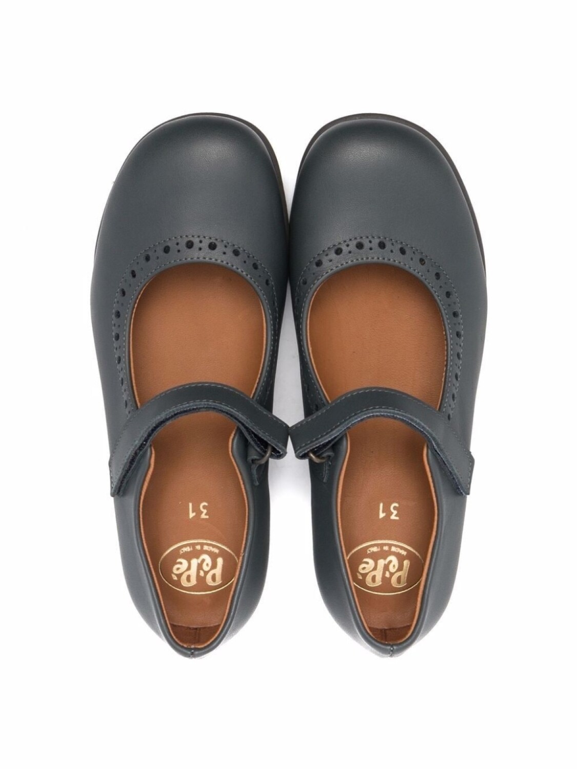 Перфорация, застежка на липучке спереди, закругленный носок и плоская резиновая подошва.