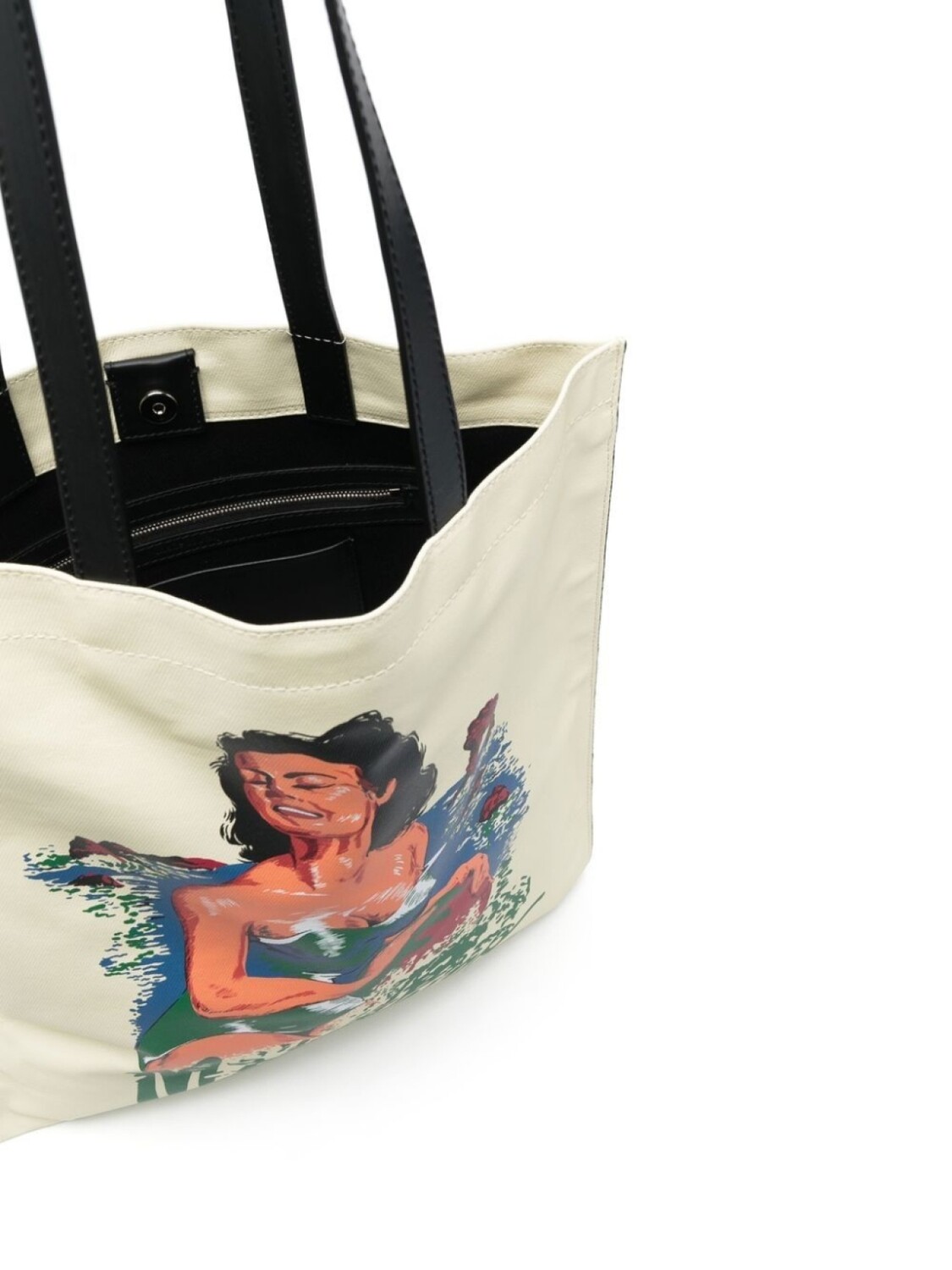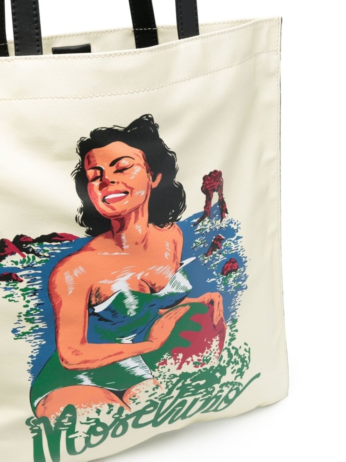 Прямоугольная форма, графичный принт спереди, логотип спереди и верхние ручки.