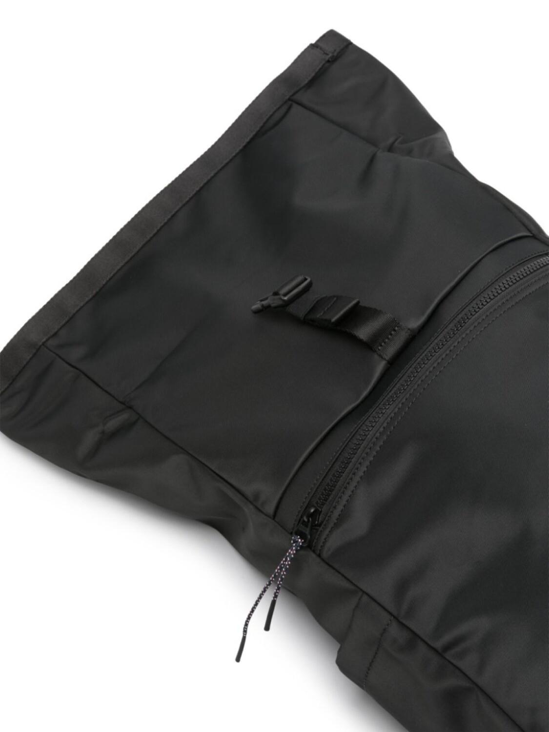 Черный, полоски, логотип спереди, конструкция роллтоп со скручивающимся верхом, карабин, ручка с плоским верхом, регулируемые лямки и основное отделение.