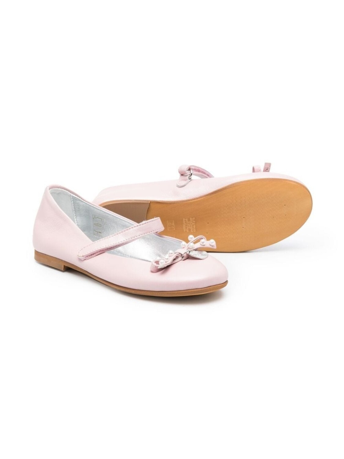 Светло-розовый, козья кожа, бант, искусственный жемчуг, подвеска с логотипом, закругленный носок, застежка на липучке спереди, стелька с логотипом и низкий каблук.