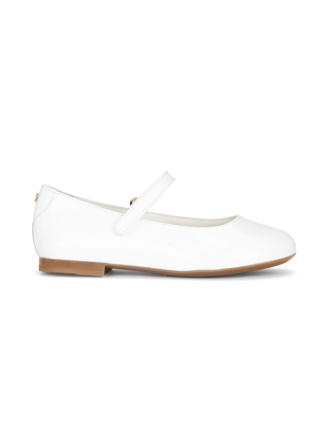 Закругленный носок, застежка на липучке спереди и плоская резиновая подошва. Цвет: белый.