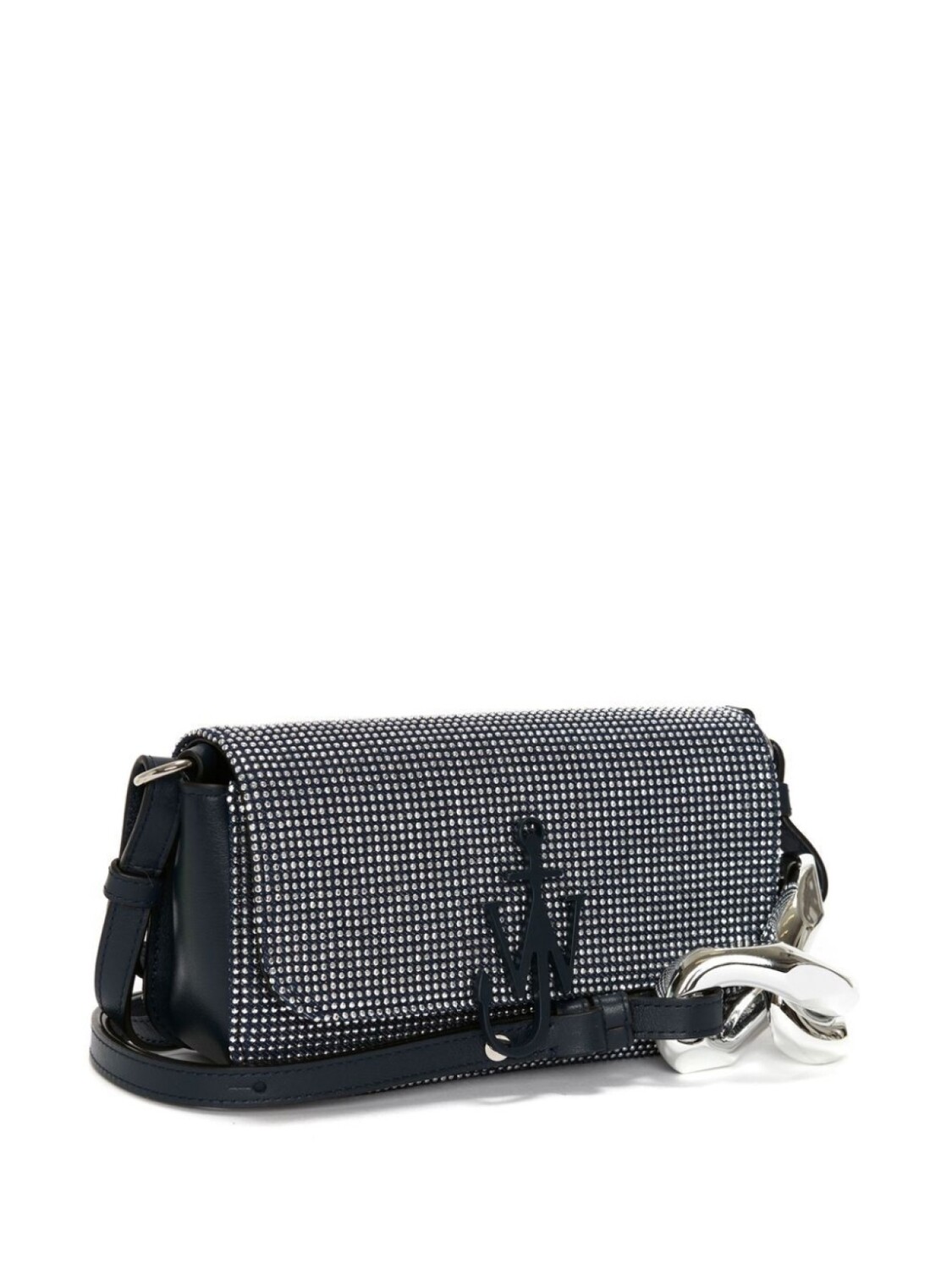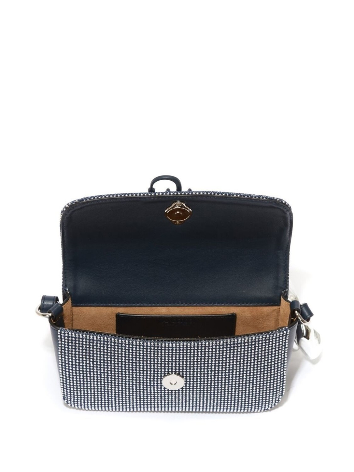Декор из кристаллов, откидной клапан на магните и ремешок-цепочка на плечо.