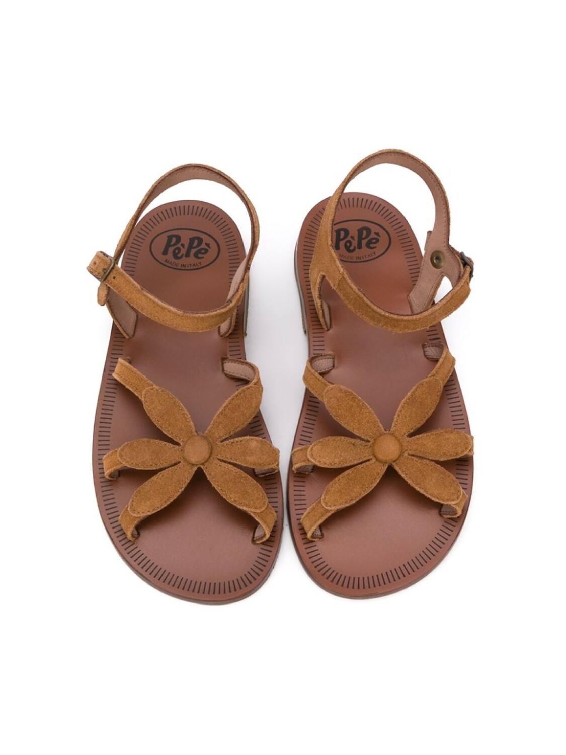 Сандалии с открытым носком от Pèpè. Фирменная стелька, ремешок на щиколотке и пряжка сбоку, плоская подошва и плоский каблук.