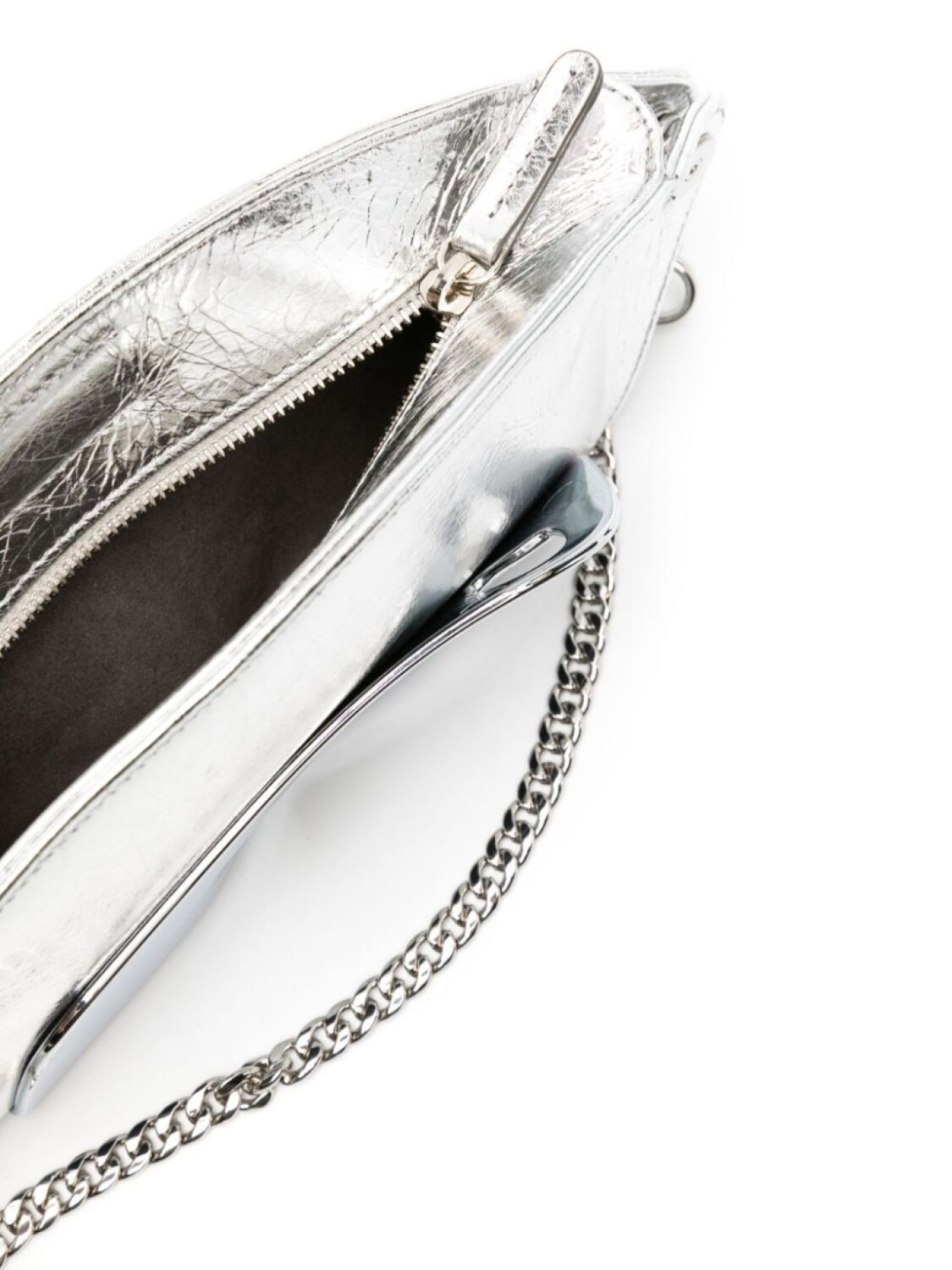 Серебристый, телячья кожа, эффект металлик, зернистая текстура, выгравированный логотип, вырезные детали, магнитная застежка, застежка на молнии сверху, съемный ремень на плечо, съемный цепочный ремень на плечо, замшевая подкладка, основное отделение и серебристая фурнитура. В комплект входит мешок-пыльник для хранения.