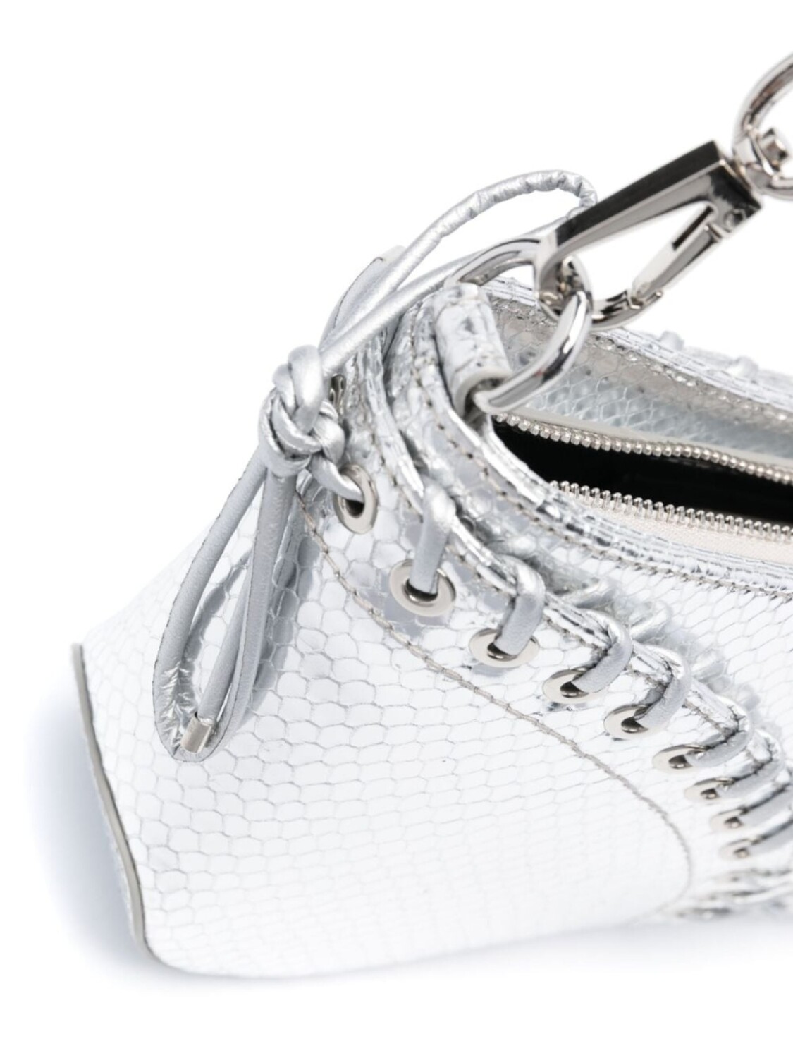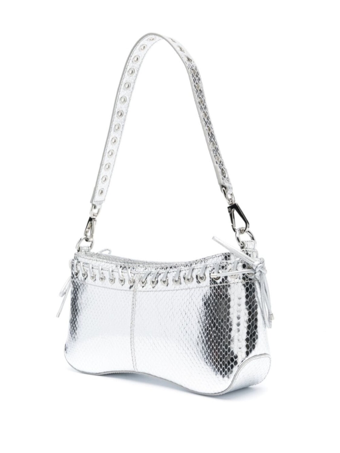 Серебристый, овечья кожа, эффект металлик, отделка с тиснением, отделка металлическими люверсами, шнуровка, тисненый логотип спереди, серебристая фурнитура, застежка на молнии сверху, съемный ремень на плечо, основное отделение и нашивка с логотипом внутри.