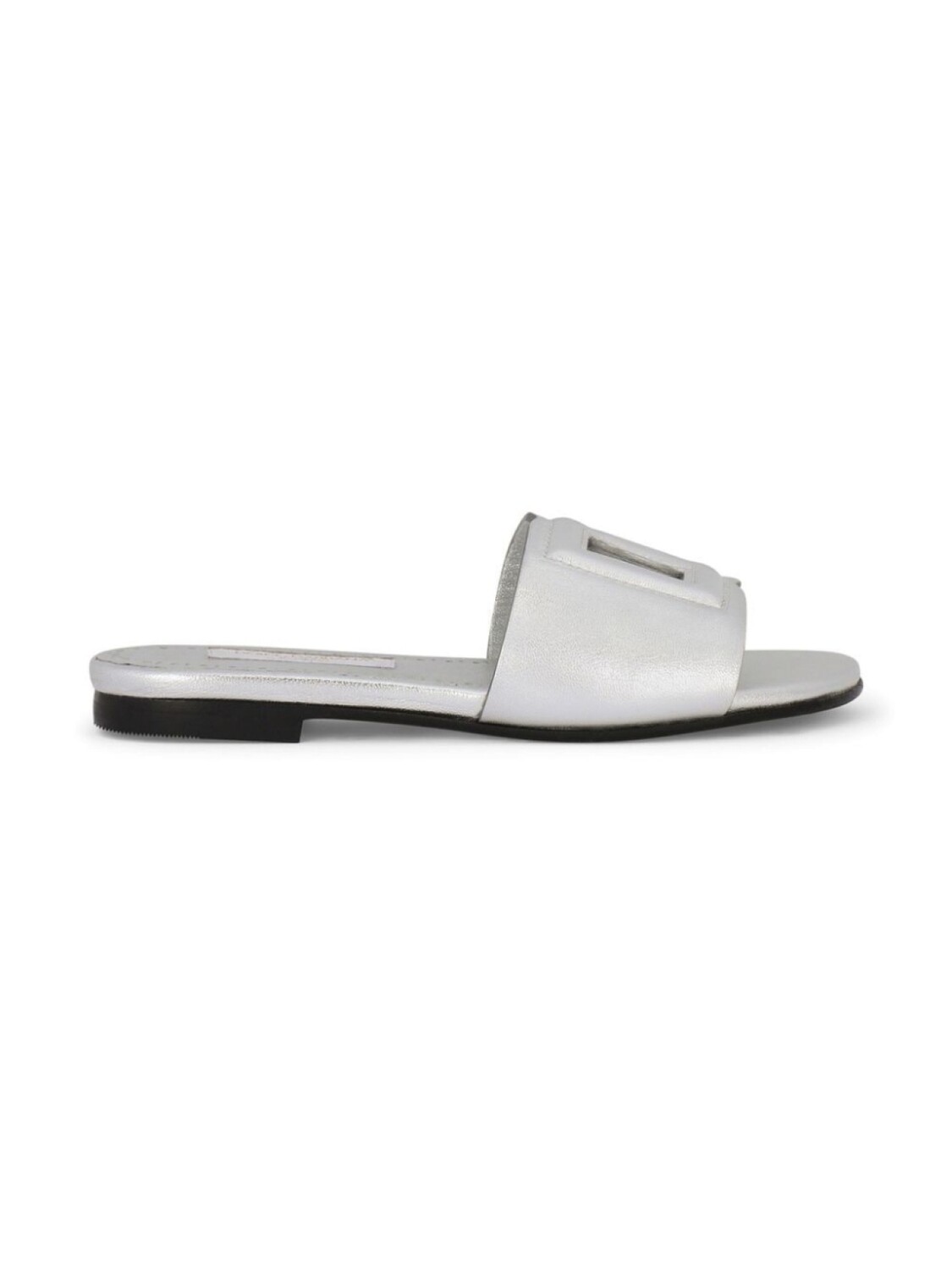 Серебро, овечья кожа, тисненый логотип спереди, вырезные детали, стелька с логотипом, модель без застежки, открытый носок и плоская кожаная подошва.
