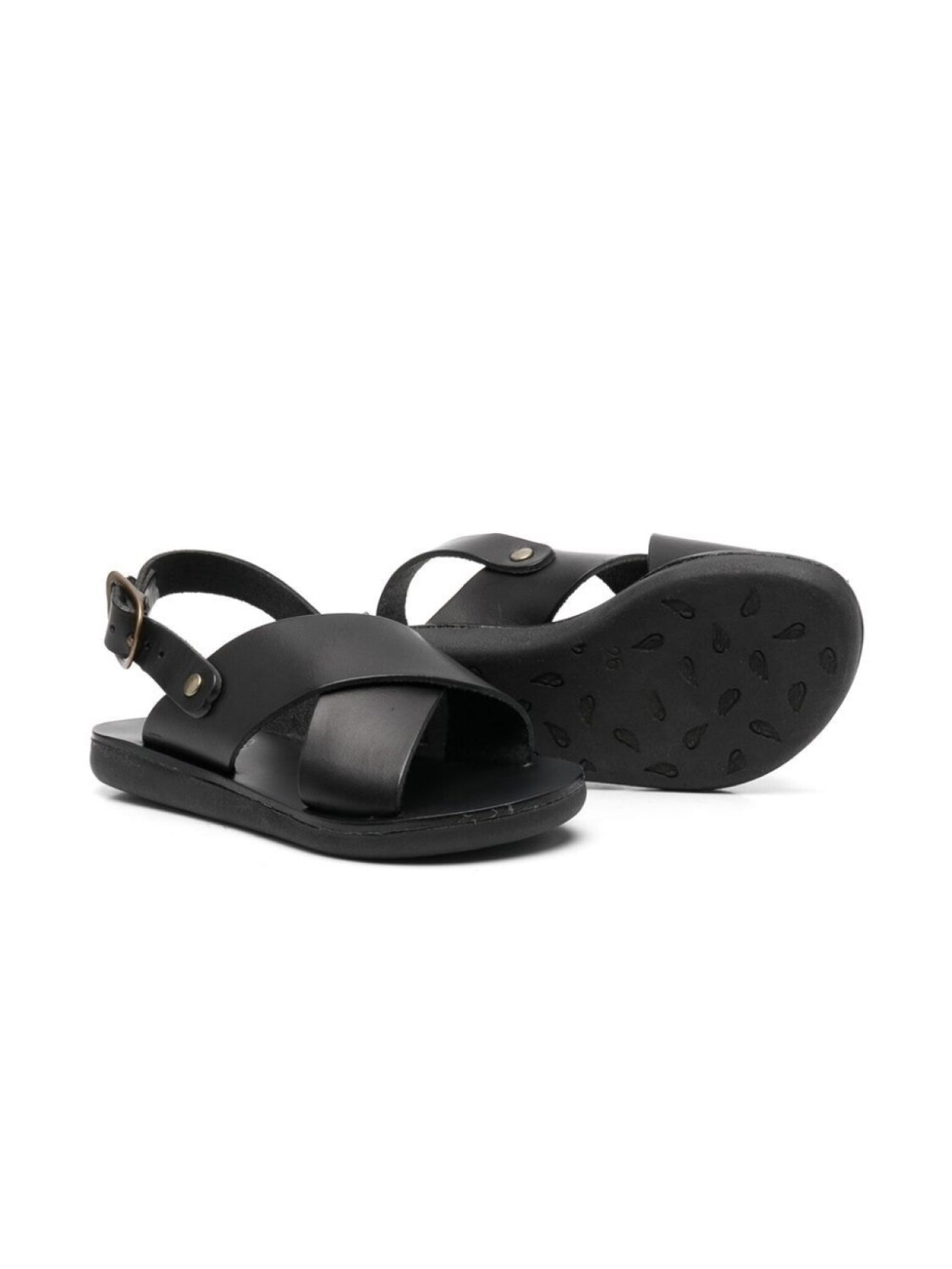Черный, кожа, перекрестные ремешки, открытый носок, застежка на пряжке и плоская резиновая подошва. Этот бренд получил хорошую оценку, потому что следит за соблюдением достойных условий труда на всех этапах цепочки поставок..