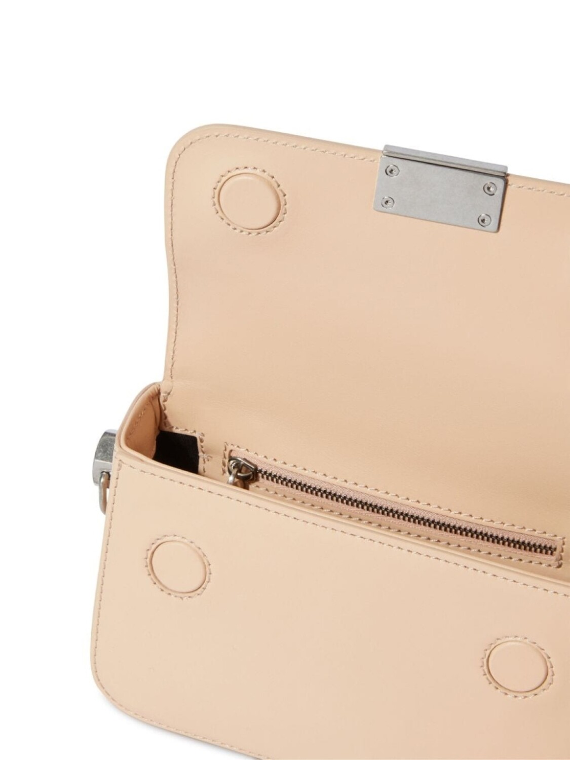 Светло-бежевый, кожа, съемный регулируемый ремень на плечо, регулируемый ремень на плечо, застежка Binder Clip, серебристая фурнитура, откидной клапан на магните, накладной карман сзади и внутренний карман на молнии.