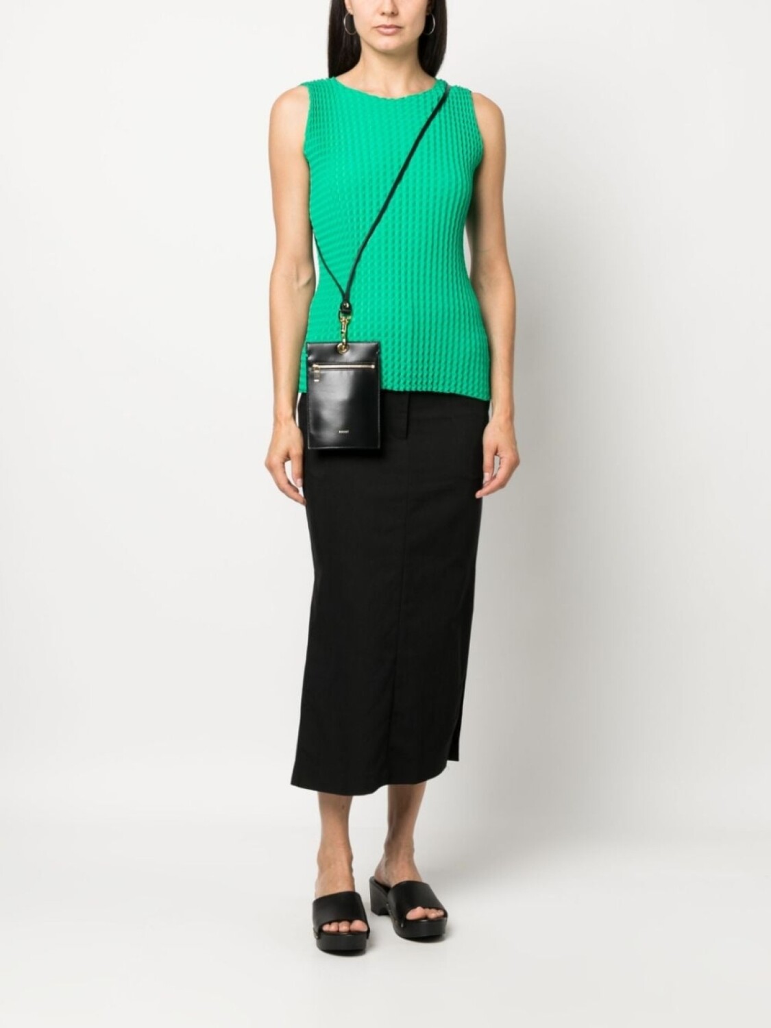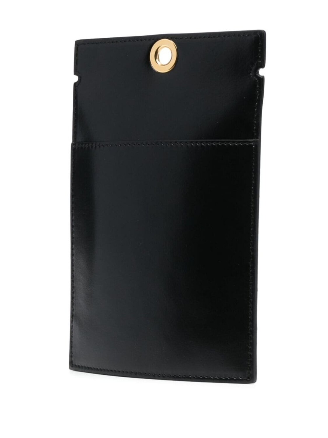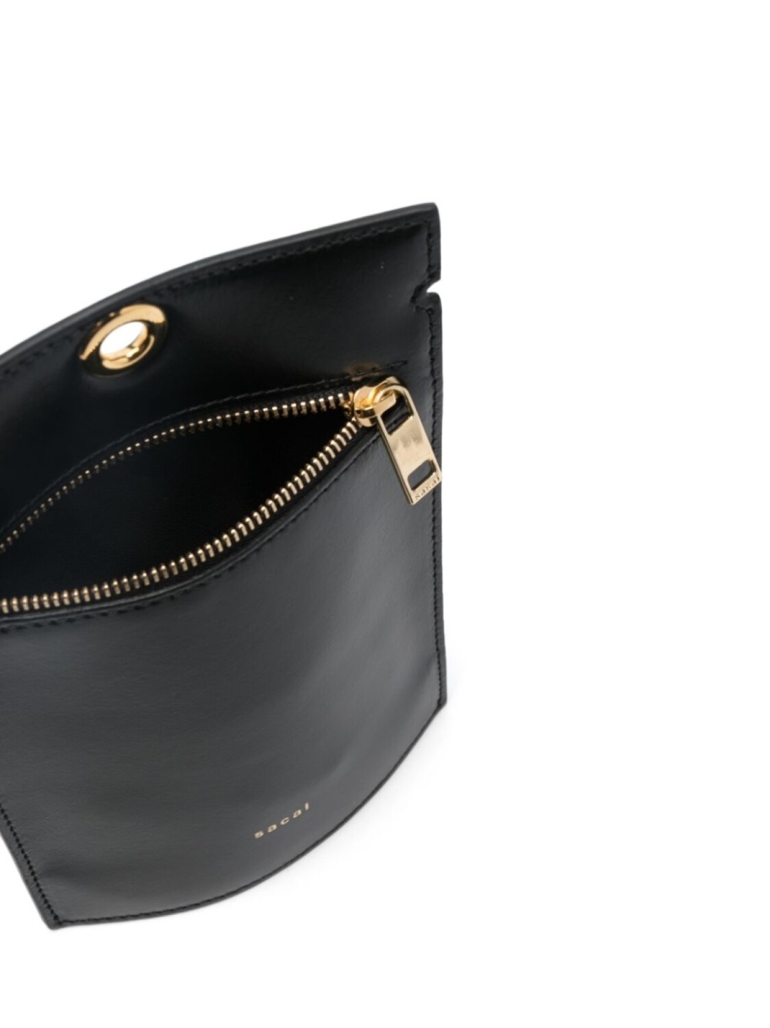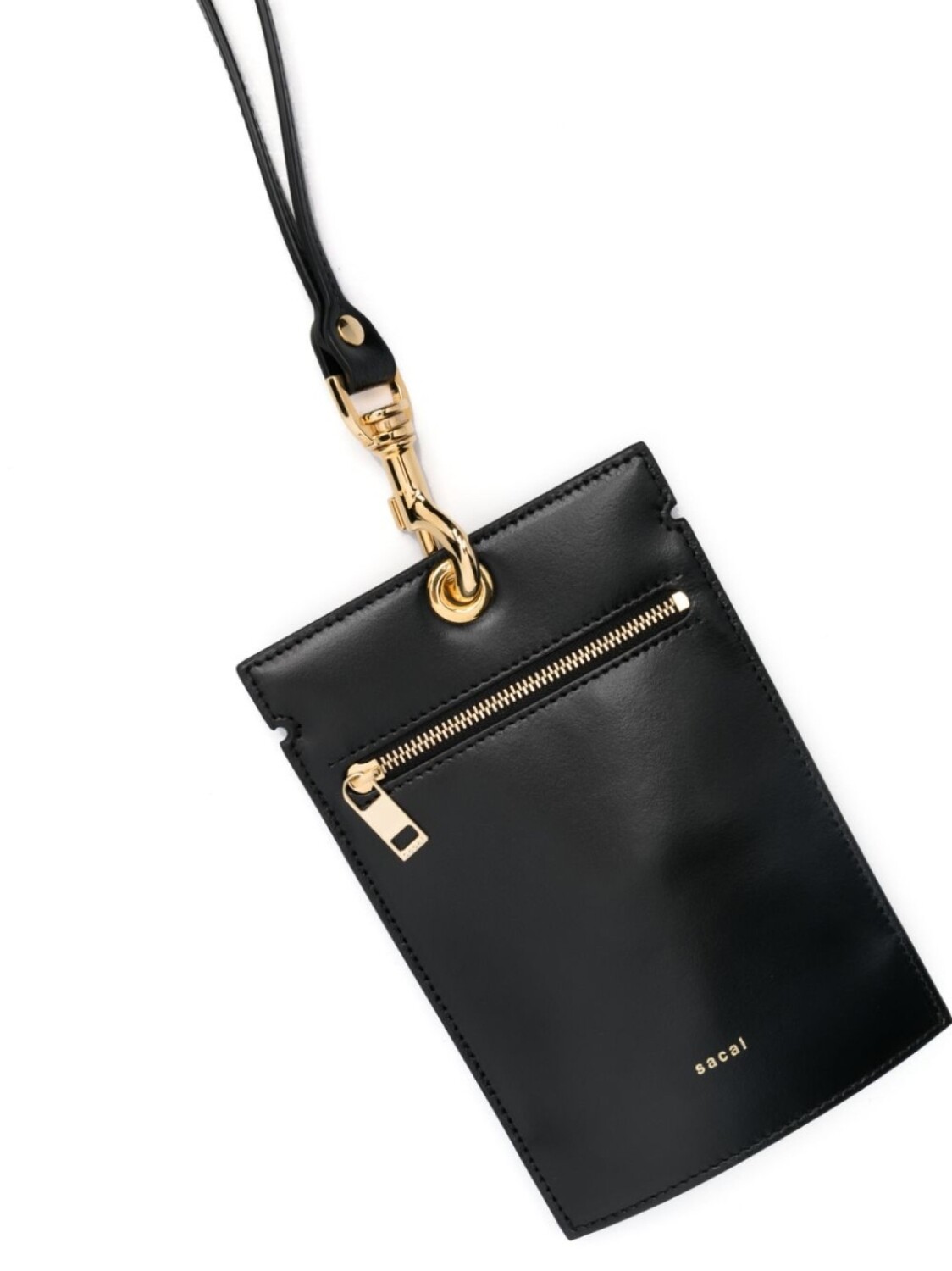 Черный, телячья кожа, тисненый логотип спереди, съемный ремень на плечо и карман на молнии спереди.