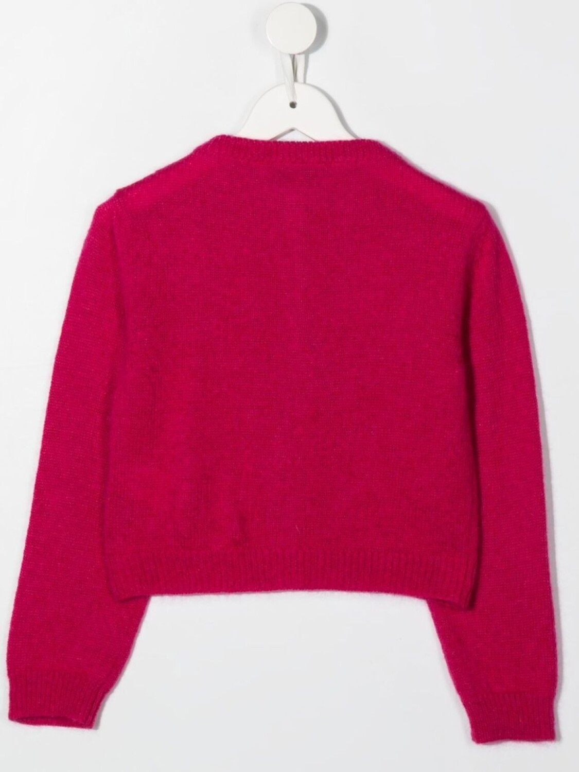 Фуксия, трикотажный материал, тонкая вязка, круглый вырез, длинные рукава и застежка на пуговицах спереди.