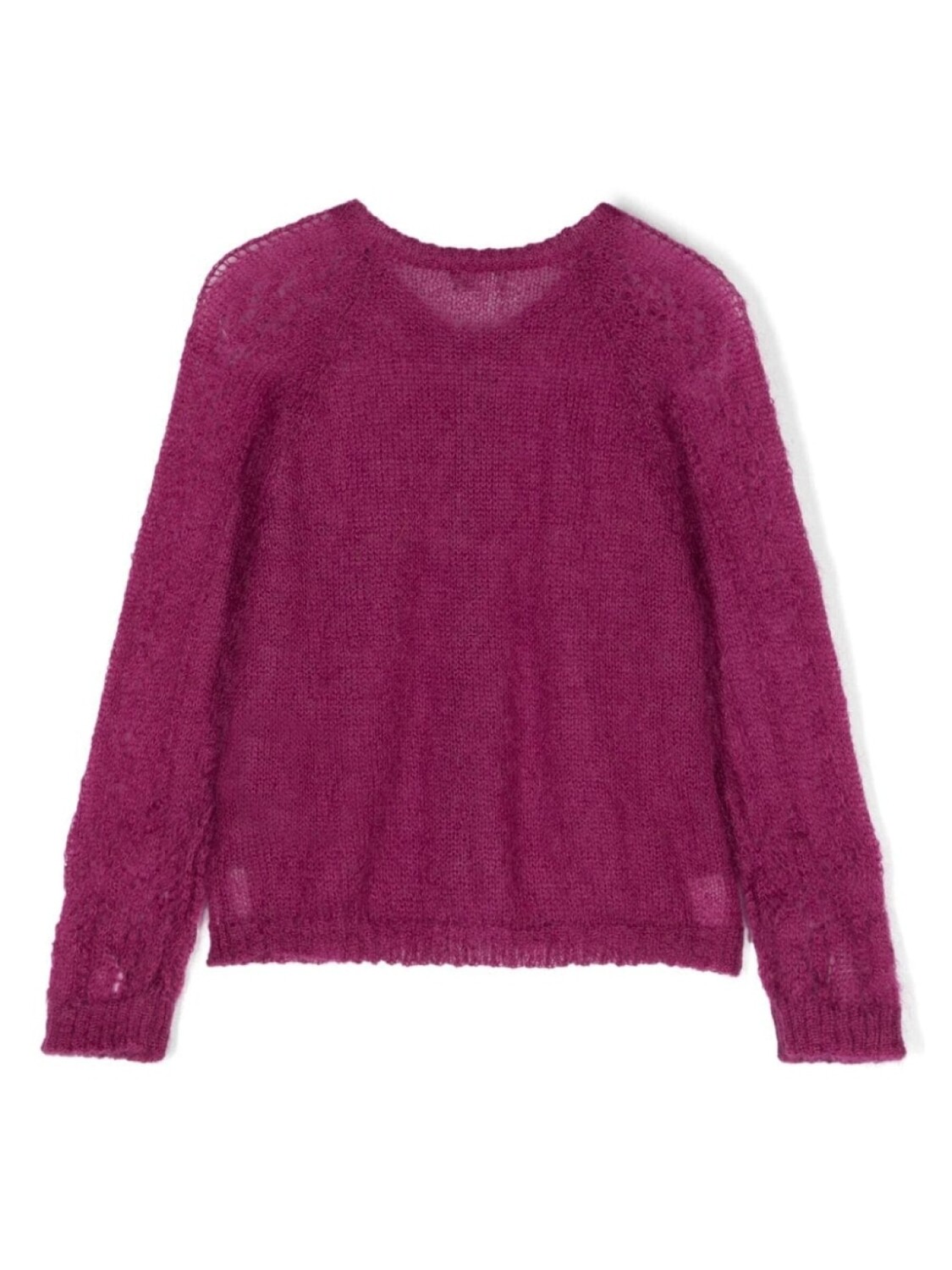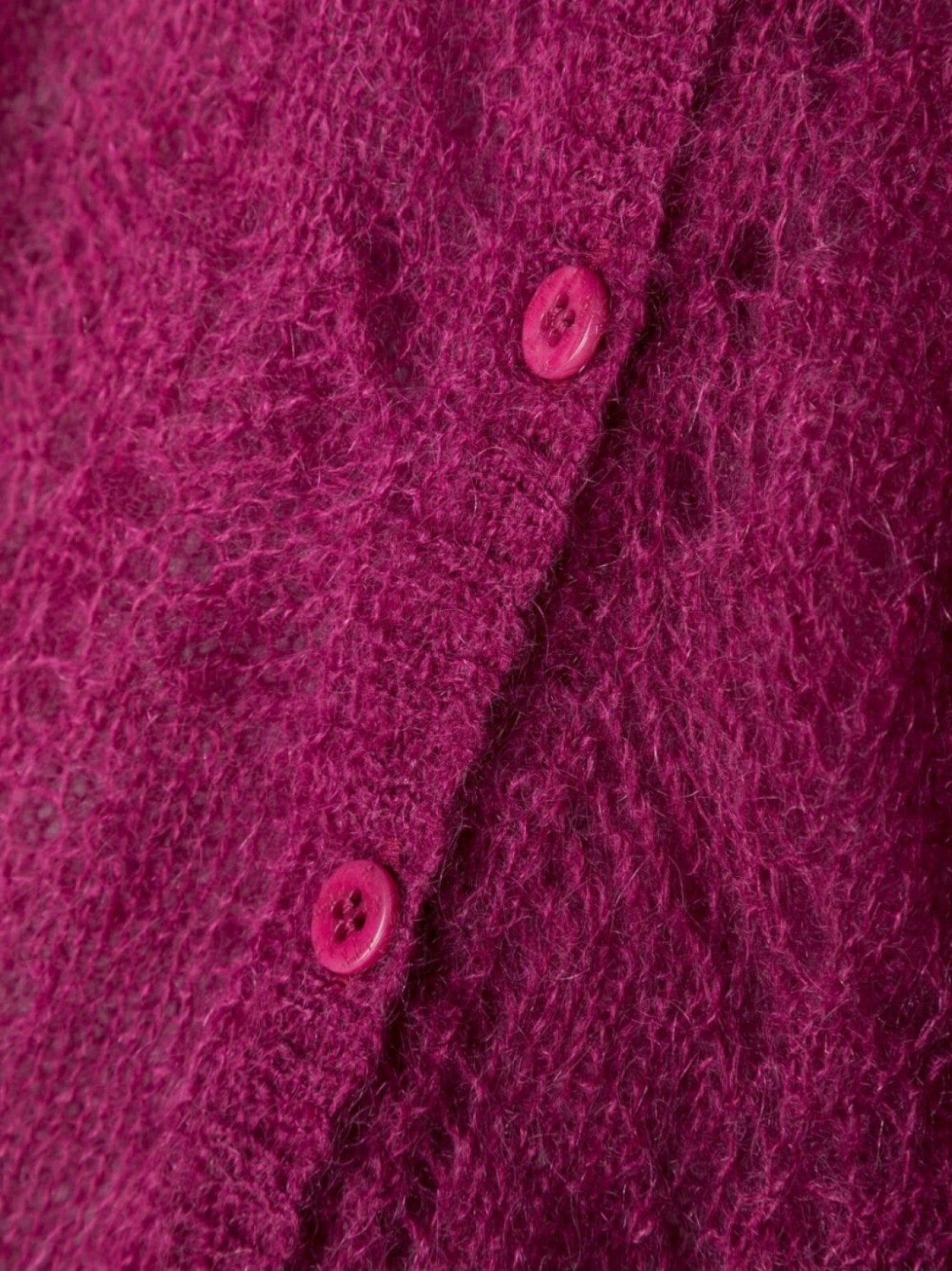 Темно-розовый, смесовый мохер, трикотажный материал, ажурная вязка, круглый вырез, застежка на пуговицах спереди, длинные рукава и прямой подол.