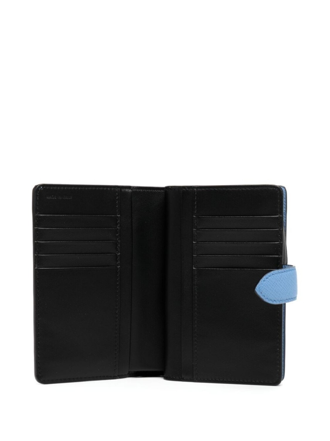 Пастельно-синий, телячья кожа, золотистый логотип, внутренние отделения для карт и застежка на защелке.