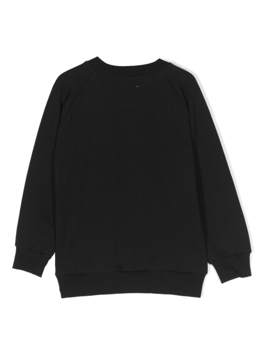 Черный, эластичный хлопок, объемная аппликация, материал c флисовой текстурой, модель анорак, круглый вырез, длинные рукава и прямой подол.