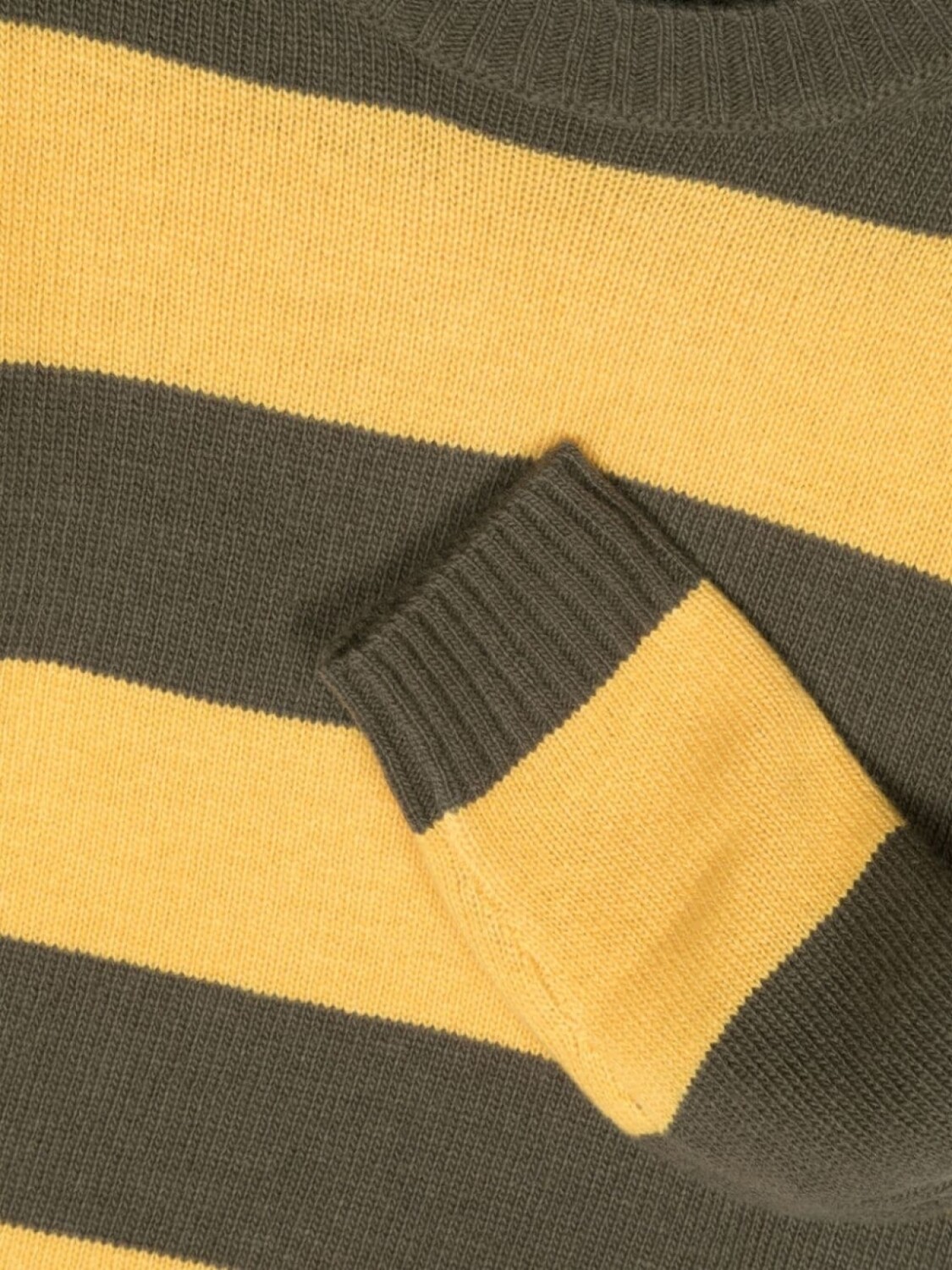 Оливково-коричневый, горчично-желтый, необработанная шерсть, узор в горизонтальную полоску, трикотажный материал, круглый вырез и длинные рукава.