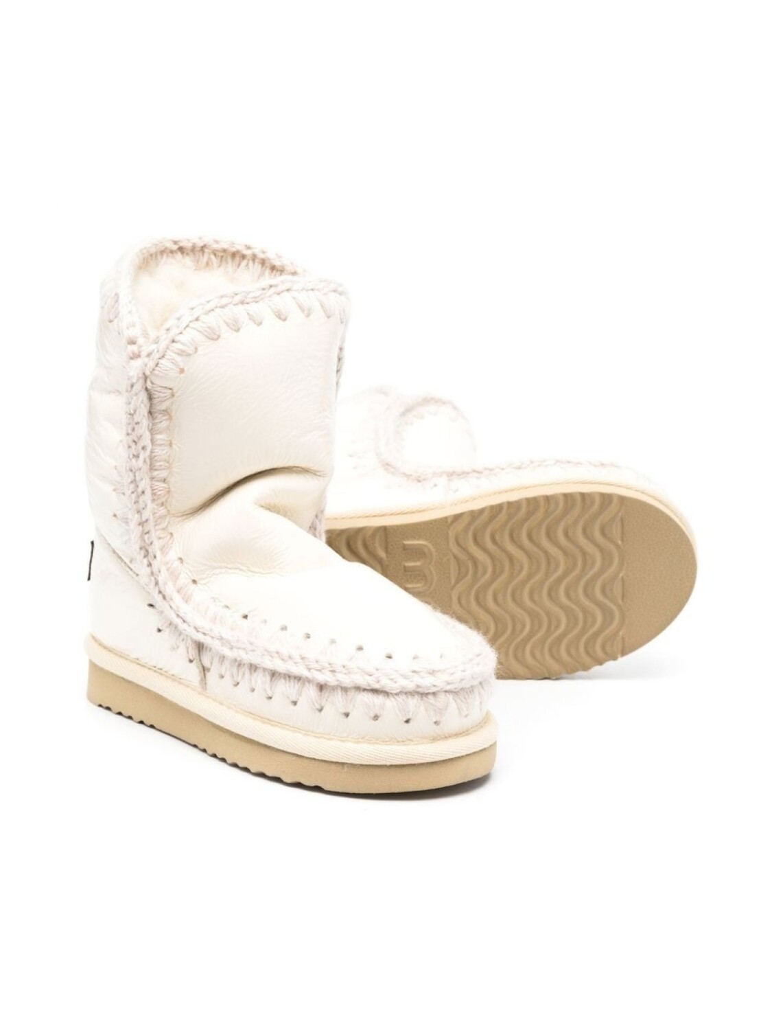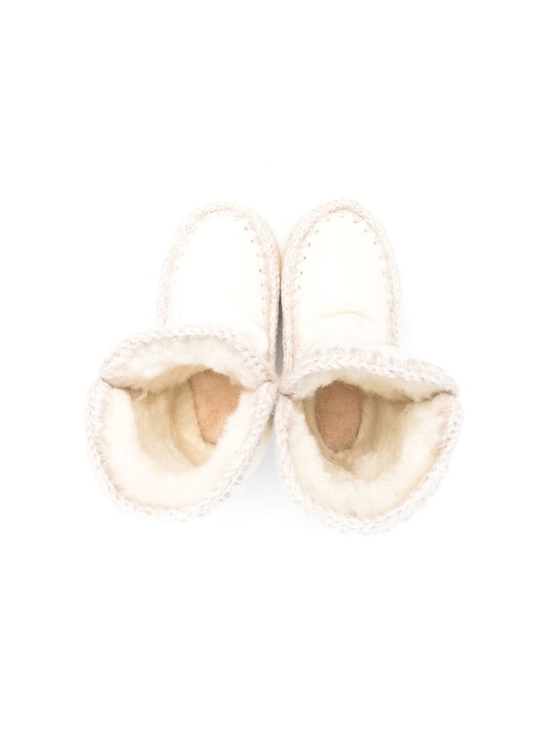 Цвет слоновой кости, овечья кожа, шерсть, подкладка из овечьей шерсти, строчка в тон, нашивка с логотипом сзади, модель без застежки, закругленный носок, высота по щиколотку и плоская резиновая подошва.