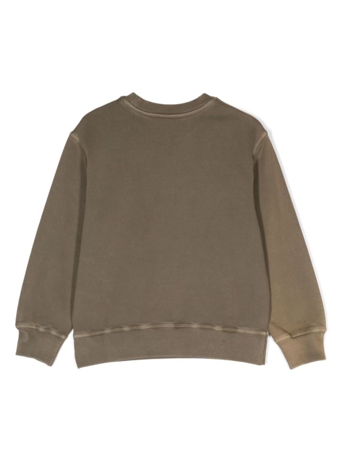 Хаки, хлопок, логотип-аппликация, эластичная отделка, круглый вырез, длинные рукава и прямой подол.