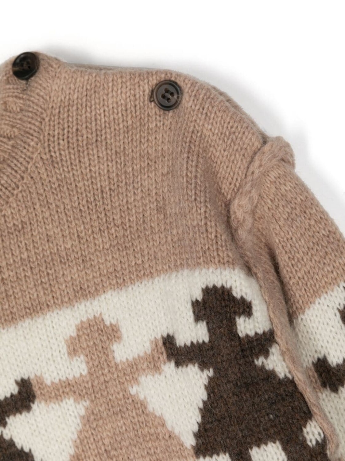 Пшеничный, смесовая необработанная шерсть, вязка в технике интарсия, круглый вырез, пуговичные застежки на плечах и длинные рукава.