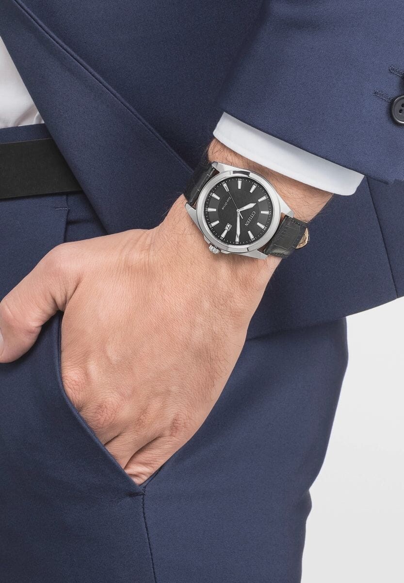 Классические шикарные мужские часы от Citizen, которые можно носить по любому поводу. Черный циферблат служит идеальной основой для серебристо-белых стрелок и индексов. Рядом с позицией «3 часа» находится указатель даты. Часы удерживаются на черном ремешке с узором под кожу крокодила.