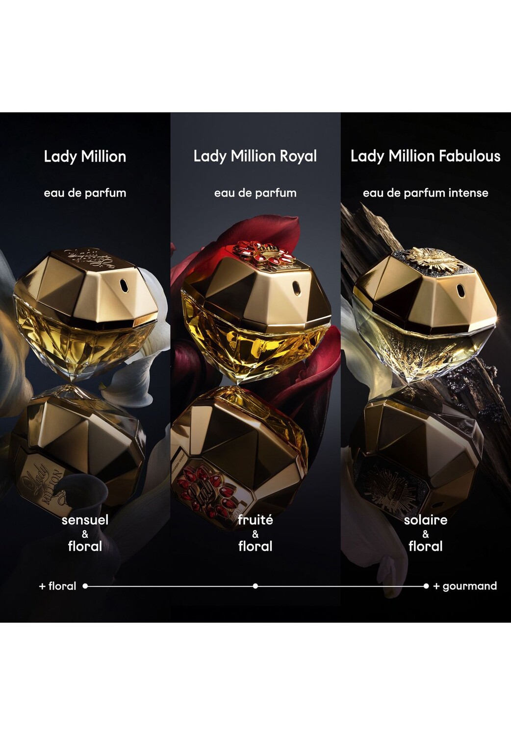 Какой королевский аромат! Paco Rabanne Lady Million Royal Eau de Parfum Spray — женский парфюм с цветочно-пряным шлейфом. Анн Флипо и Домитий Мишалон-Бертье вместе создали аромат. Открывают его верхние ноты граната, мандарина и растительных нот. В сердце доминирует букет белых цветов: здесь цветет жасмин, флердоранж и тубероза. Аромат завершается нотами кашмерана, мускуса и пачули.