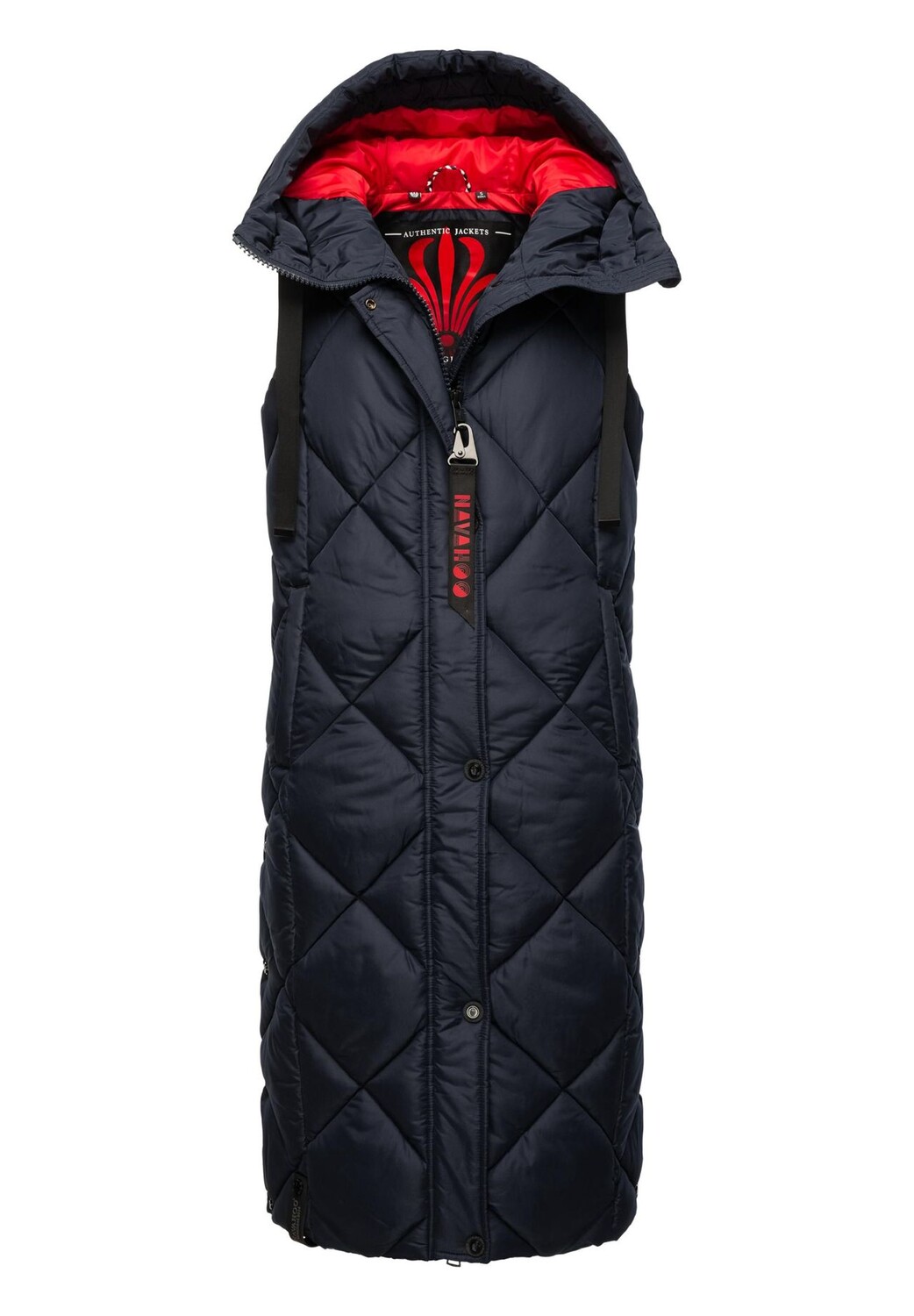 Описание товара: ВИД: Длинный женский жилет без рукавов с модной клетчатой ​​стежкой от Navahoo - при правильном сочетании он идеален для холодного времени года (осени и зимы), а также для прохладных весенних дней. МАТЕРИАЛ: Жилет для отдыха (длинный жилет) изготовлен из матового мерцающего внешнего материала и имеет теплую, мягкую подкладку, которая очень удобна в ношении и в сочетании с воротником-стойкой прекрасно сохраняет тепло. поэтому носите под ним толстый свитер. Он имеет большую длину примерно до середины икры, но благодаря боковым разрезам (на кнопках) никоим образом не ограничивает свободу движений. ДЕТАЛИ: Стеганая модель без рукавов.