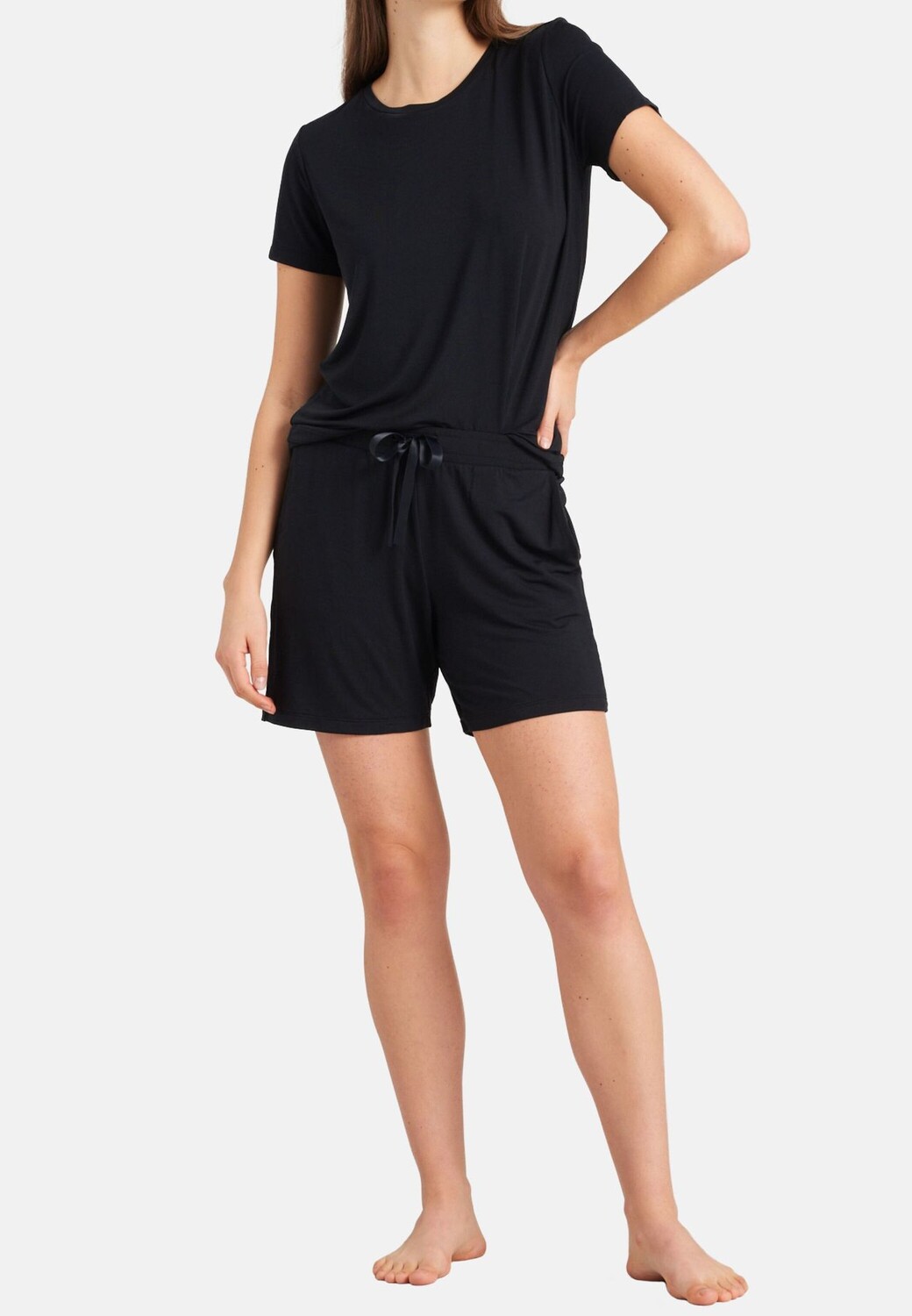 Базовая вещь, которая не должна отсутствовать в любом гардеробе! Эти короткие женские брюки классического дизайна выглядят просто великолепно. Эластичный пояс с элегантным атласным ремешком и повседневные боковые карманы гарантируют комфорт. Изюминкой является удивительно мягкий одинарный трикотаж, изготовленный из модала с добавлением эластана. Материал легко струится, дышит и за ним легко ухаживать. Лучшее качество для общения и отдыха!