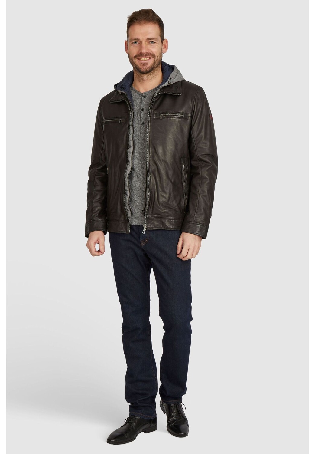 В этой повседневной мужской кожаной куртке вы всегда будете в тренде. Благодаря тканевой вставке в крапинку она не только отлично выглядит, но и практична, ведь стеганый капюшон с внутренней стороны — идеальный спутник в ветер и непогоду. Образ 2-в-1 дополнен тонкими декоративными швами и карманами на молнии. Идеальная куртка на каждый день.