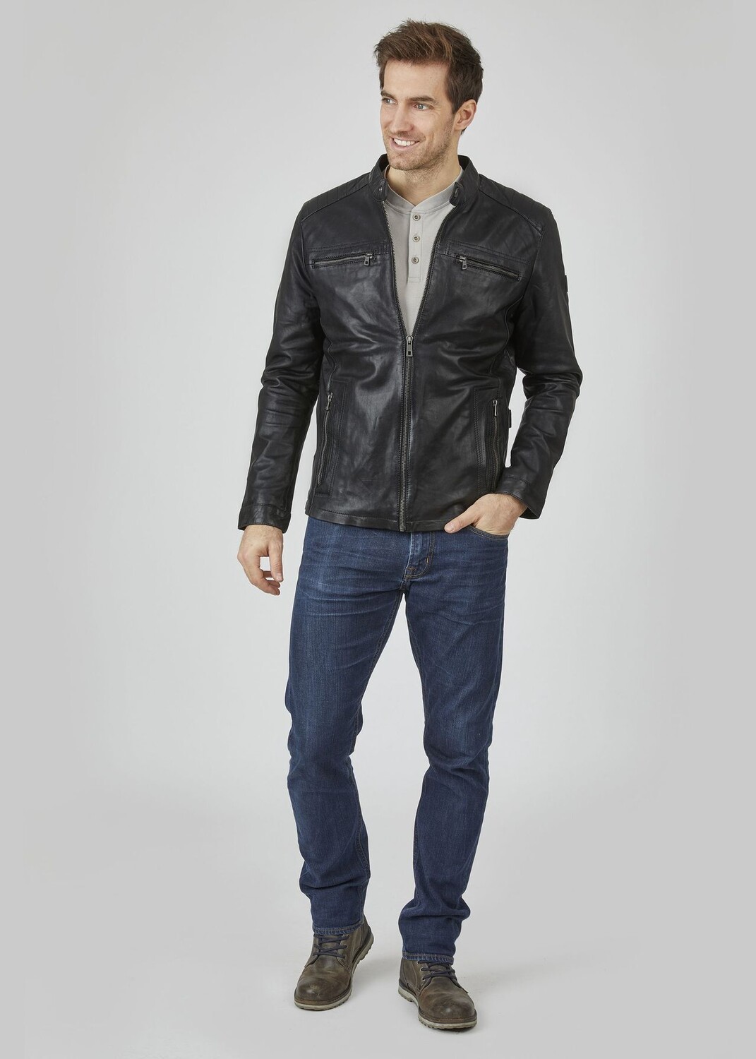 В этой спортивной мужской кожаной куртке от bugatti вы всегда будете в отличном стиле, когда будете в пути. Прямой крой обеспечивает удобную посадку, а мягкая кожа ягненка растительного дубления обеспечивает комфорт при ношении. Отстрочка в области плеч и кнопки на воротнике-стойке, рукавах и талии расставляют модные акценты. Практичные прорезные карманы и карманы на молнии идеально вписываются в дизайн. Эта кожаная куртка станет вашей новой любимой вещью.