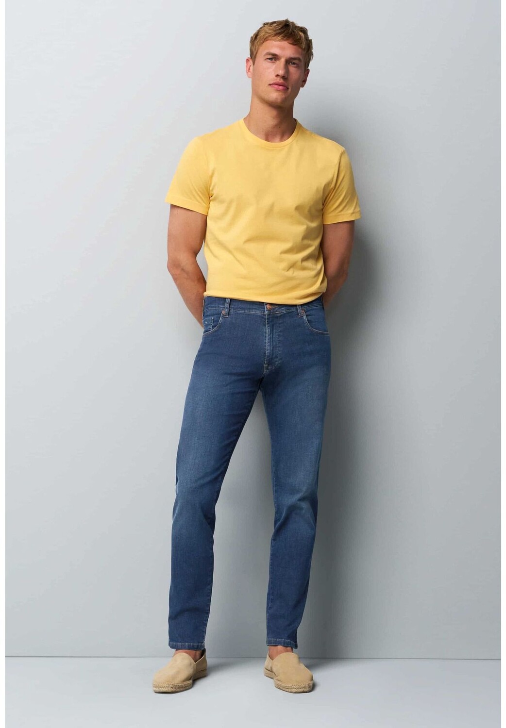 Общие инструкции по уходу: не отбеливать, сушить при умеренной температуре; Очистка P; Бережная сушка: 40°C Легкий уход Инструкции по уходу за тканями: Обычная стирка при 40°C, не отбеливать, бережная сушка в сушильной машине, гладить при умеренной температуре, чистить с помощью стиральной машины. перхлорэтилен Материал одежды: Всего: 98 % хлопок, 2 % эластан