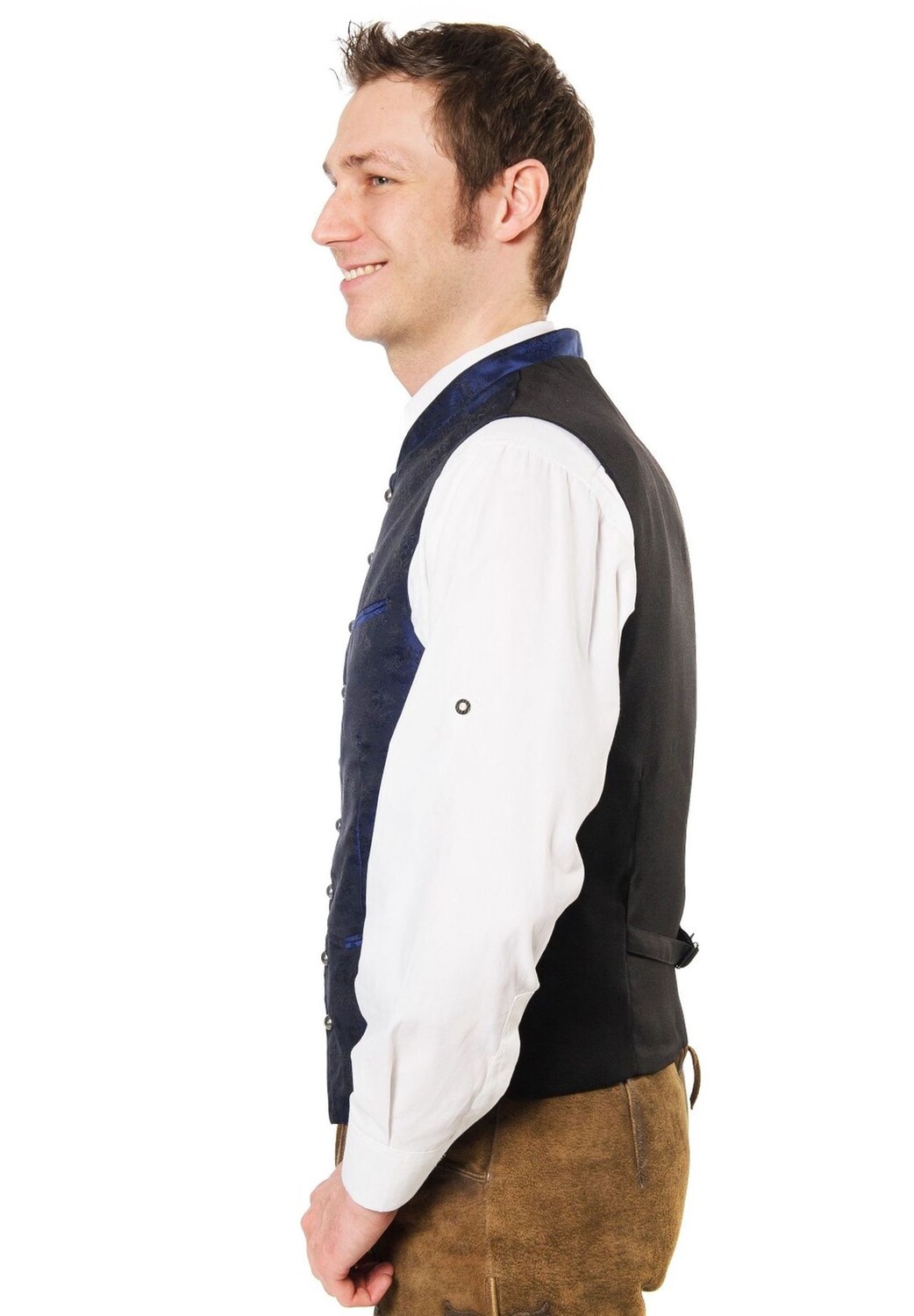 Описание товара: Высококачественный классический традиционный жилет из элегантной ткани королевского синего цвета. Элегантный традиционный жилет элегантного темно-синего цвета придаст вашему традиционному образу правильное сочетание эффектности и сдержанности. Внешняя ткань королевского синего цвета слегка сияет и раскрывает классический ровный рисунок. Будь то следующий фольклорный праздник, причастие или свадьба – наш традиционный жилет «Константин» всегда станет правильным выбором, если вы будете одеты элегантно и изысканно. Задняя часть выполнена в простом черном цвете и может быть скорректирована и сделана уже с помощью соответствующей ленты и пряжки. Это означает, что вы всегда можете оптимально подогнать жилет под свой размер! В двух набедренных карманах и нагрудном кармане достаточно места для того и этого. Серебристые шариковые пуговицы дополняют элегантный традиционный вид жилета.