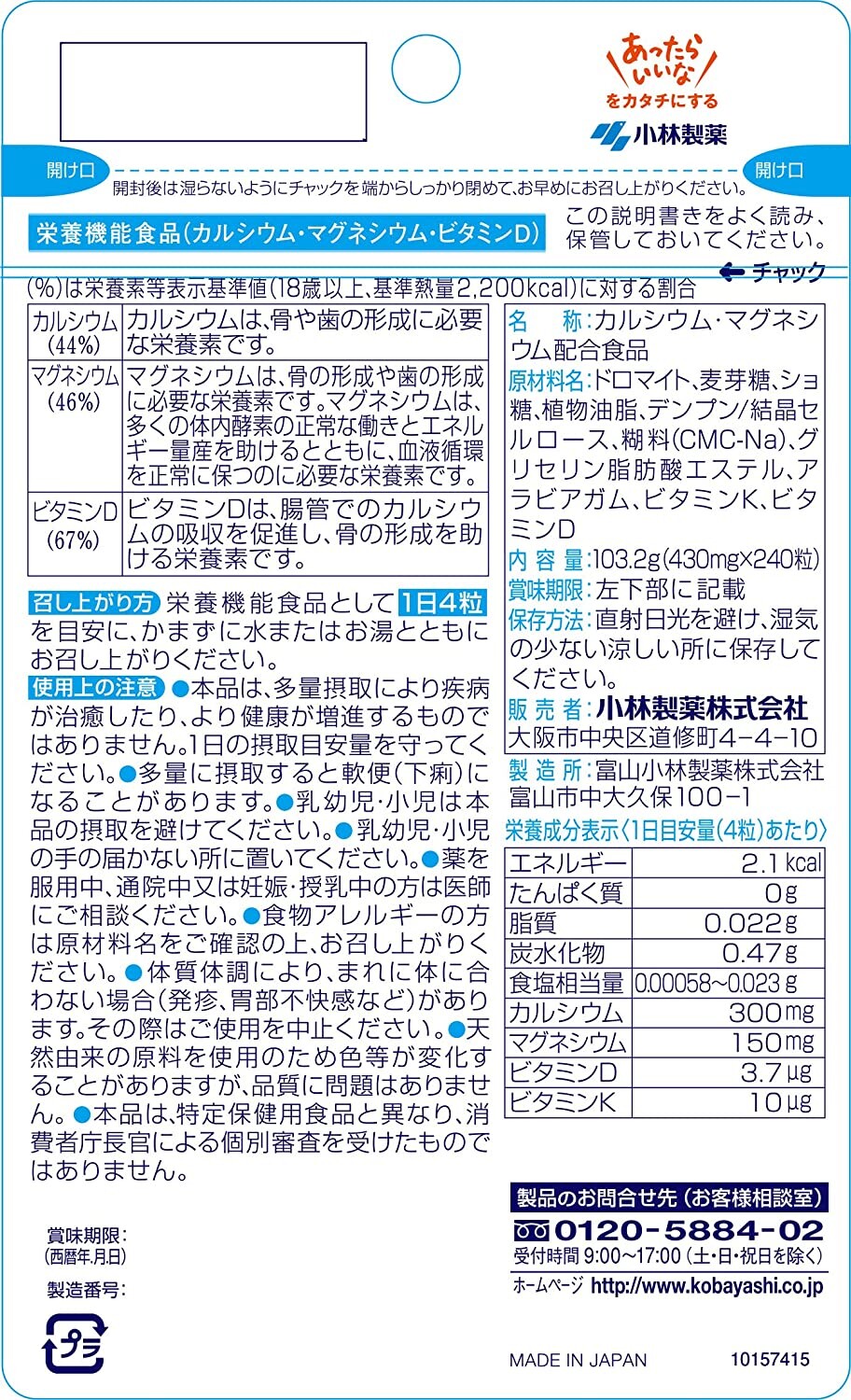 Состав: доломит (содержащий кальций и магний) 375,0 мг, растительное масло, содержащее витамин D 0,038 мг, витамин K 0,0025 мг, микрокристаллическая целлюлоза 23,5 мг, мальтоза 15,9 мг ,карбоксиметилцеллюлоза Na 7,5 мг, сложный эфир жирной кислоты глицерина 6,5 мг, гуммиарабик 0,78 мг, сахар 0,6 мг, растительное масло 0,11 мг, крахмал 0,1 мг.