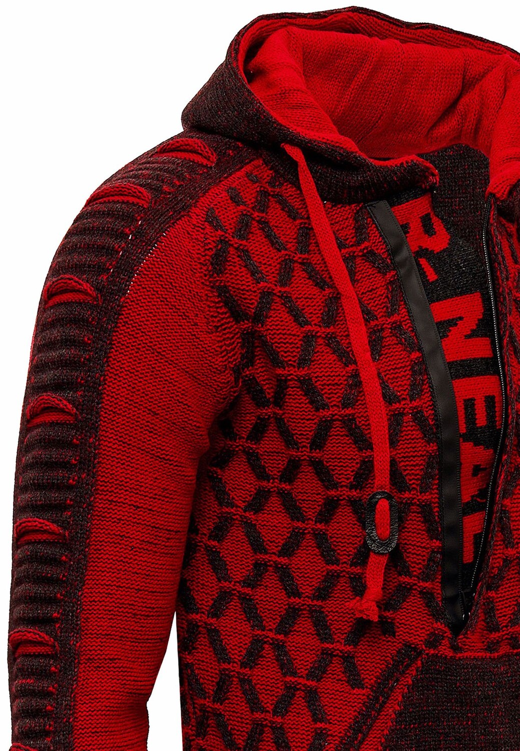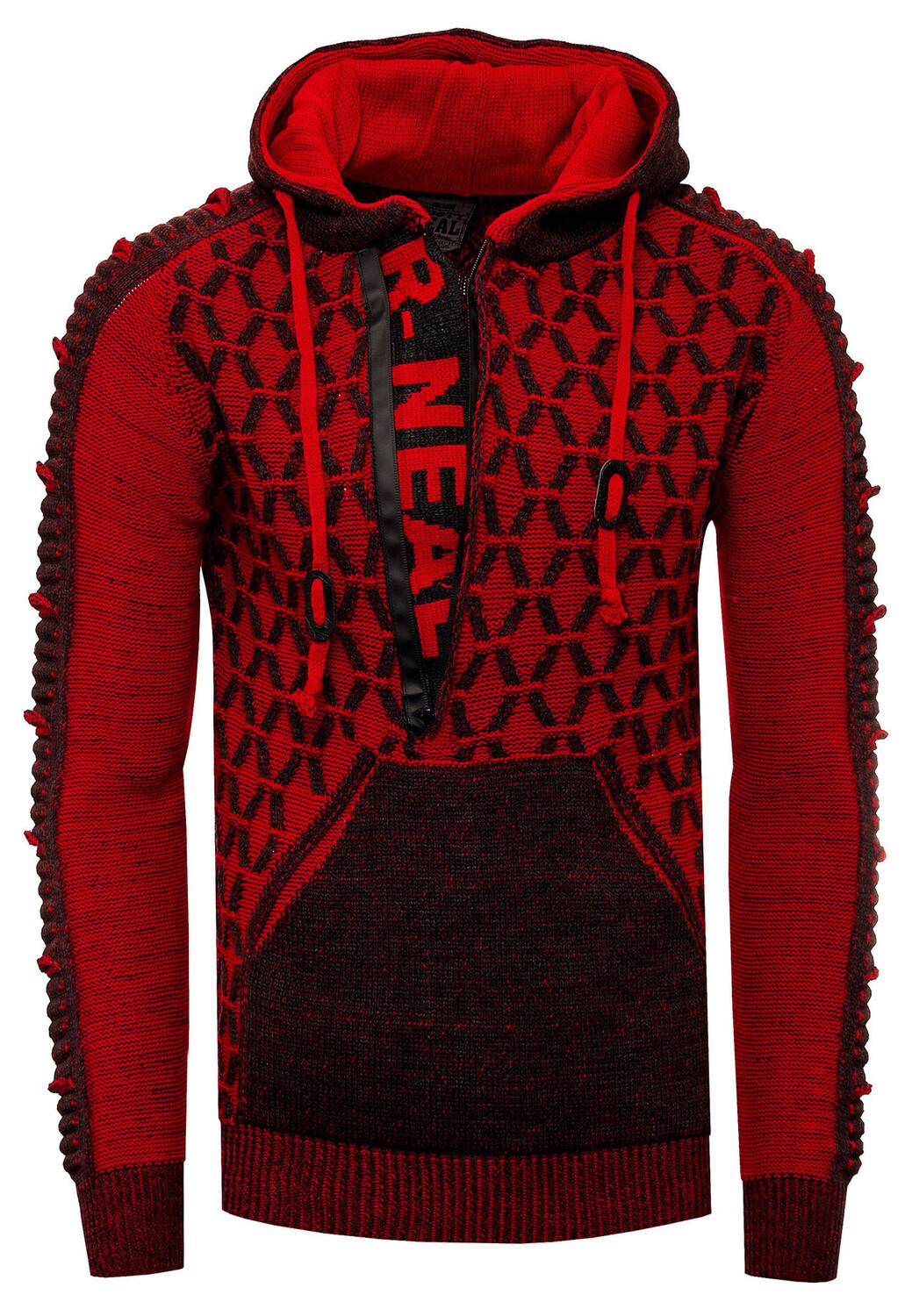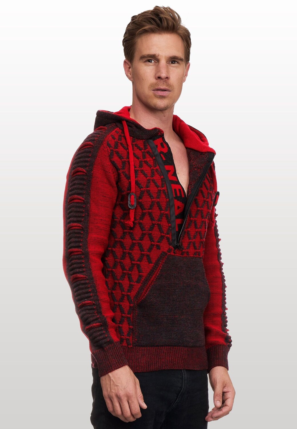 Особенности Необычный вязаный мужской свитер от Rusty Neal С Карман-кенгуру контрастного цвета Прикольное сочетание различных узоров Капюшон на шнурке сохраняет тепло