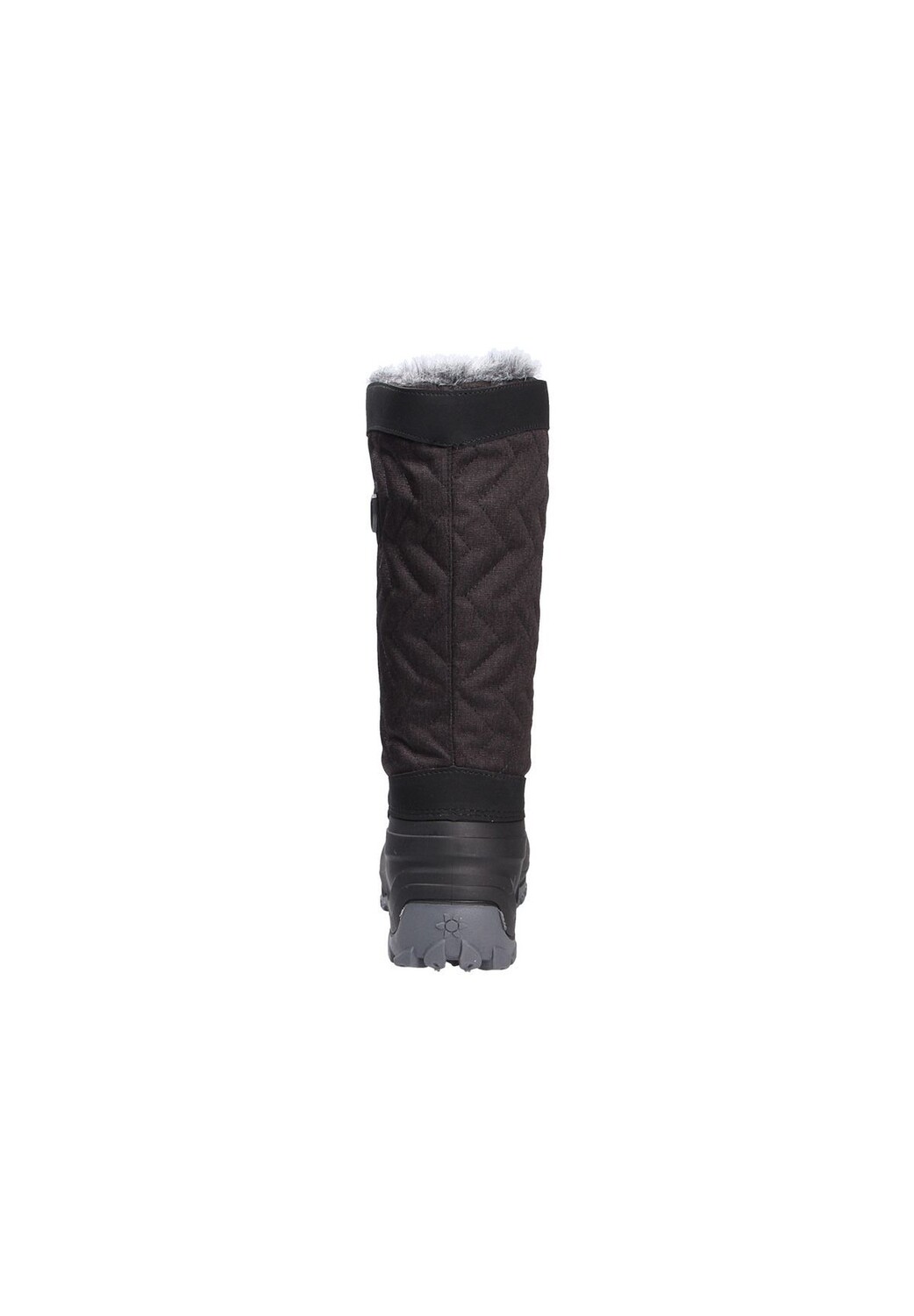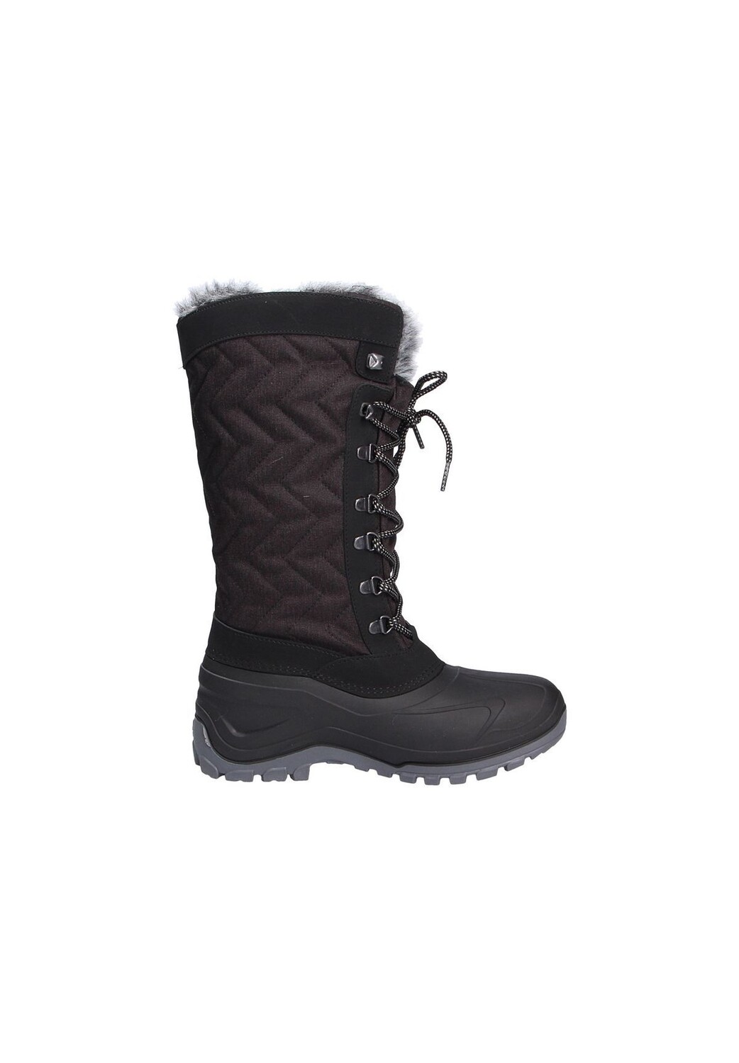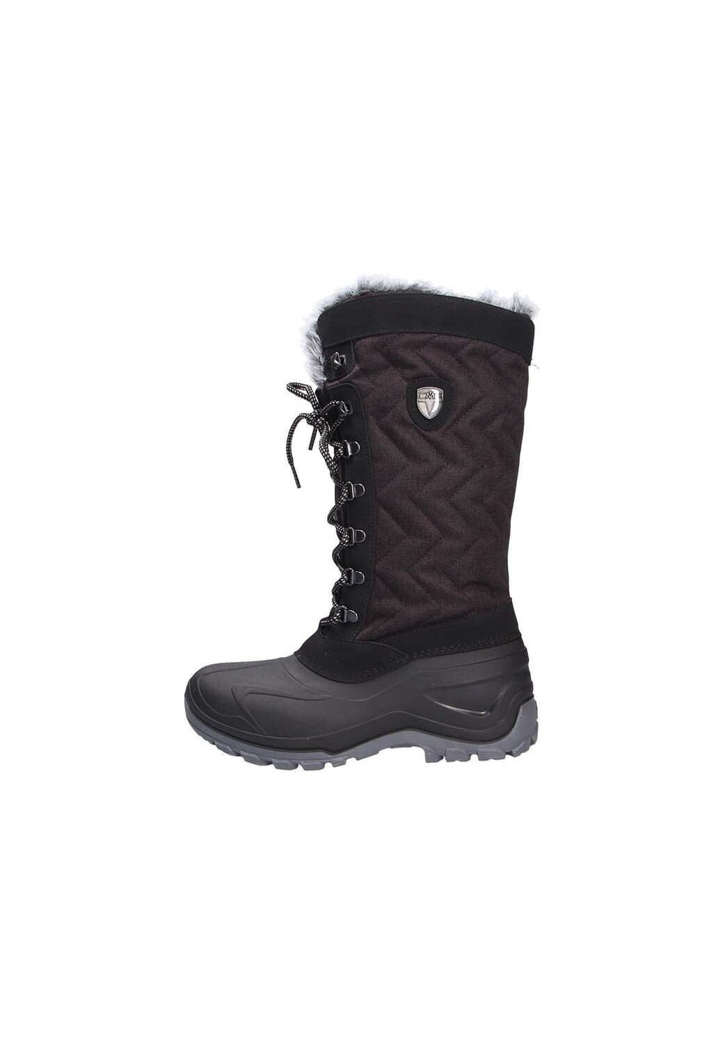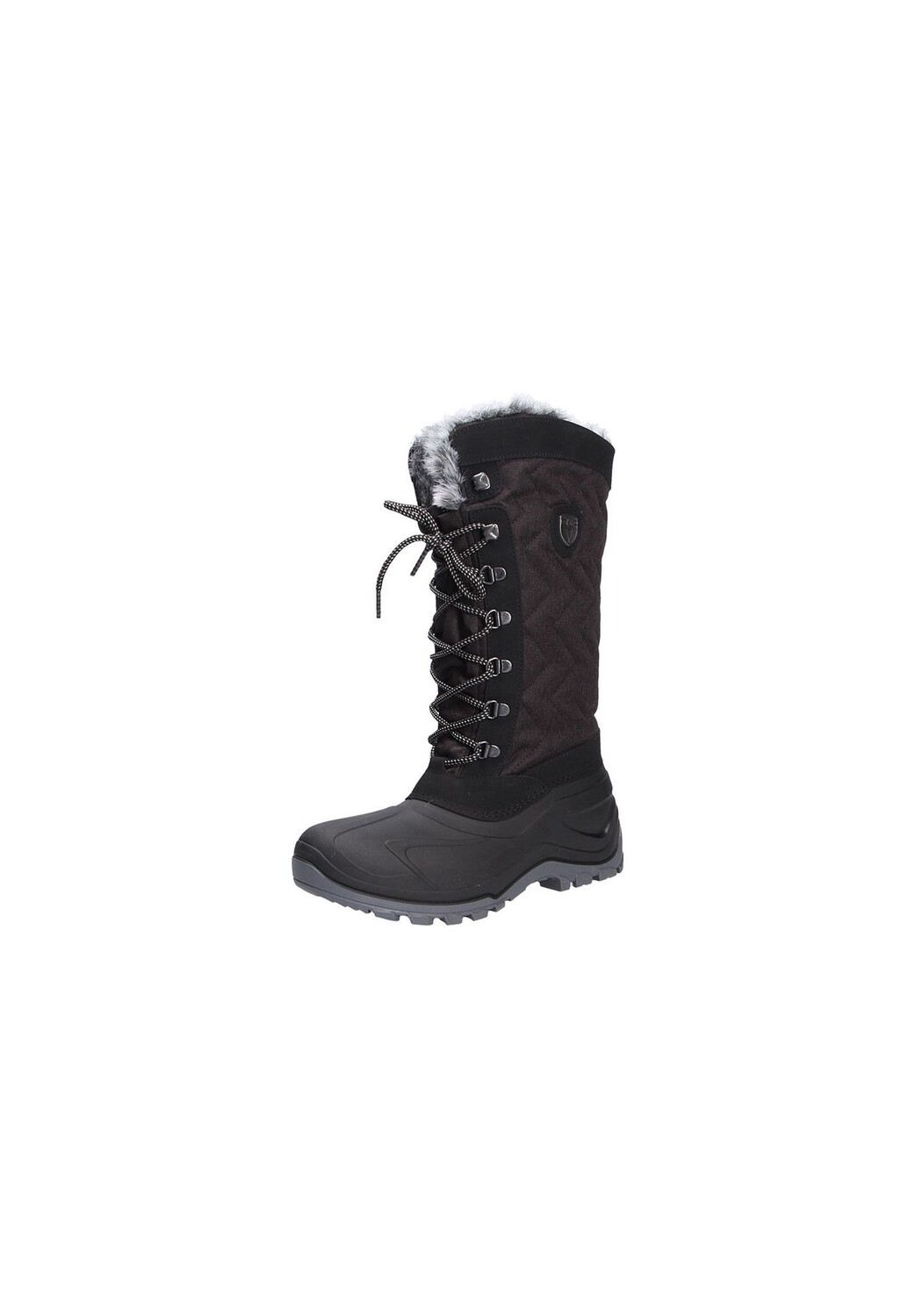 Высокие зимние ботинки из стеганого текстиля с деталями, имитирующими замшу, и прочной резиновой окантовкой; шнуровка с металлическими люверсами; голенище на подкладке из искусственного меха; теплая плюшевая подкладка; сильно профилированная резиновая подошва; Деталь этикетки.