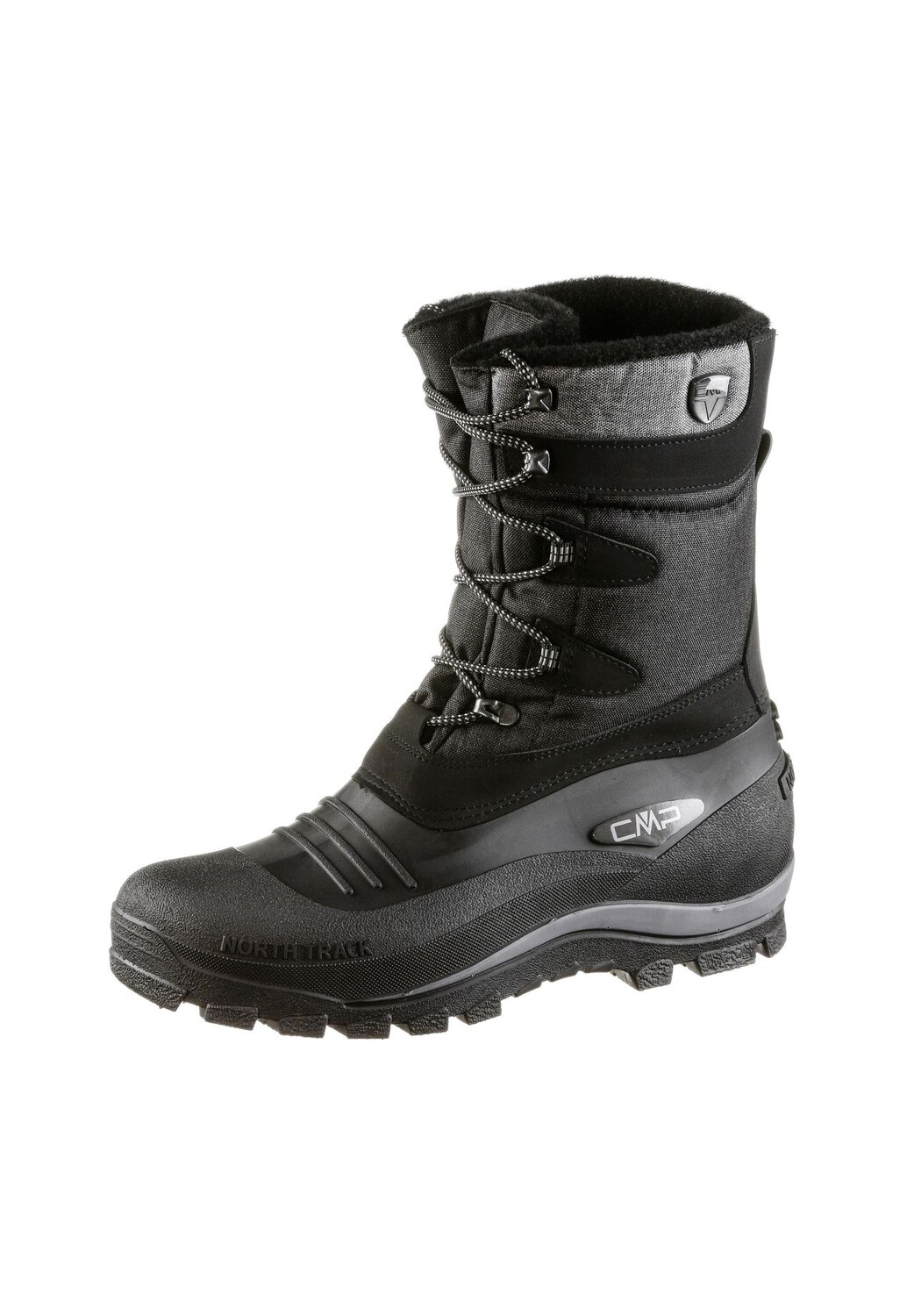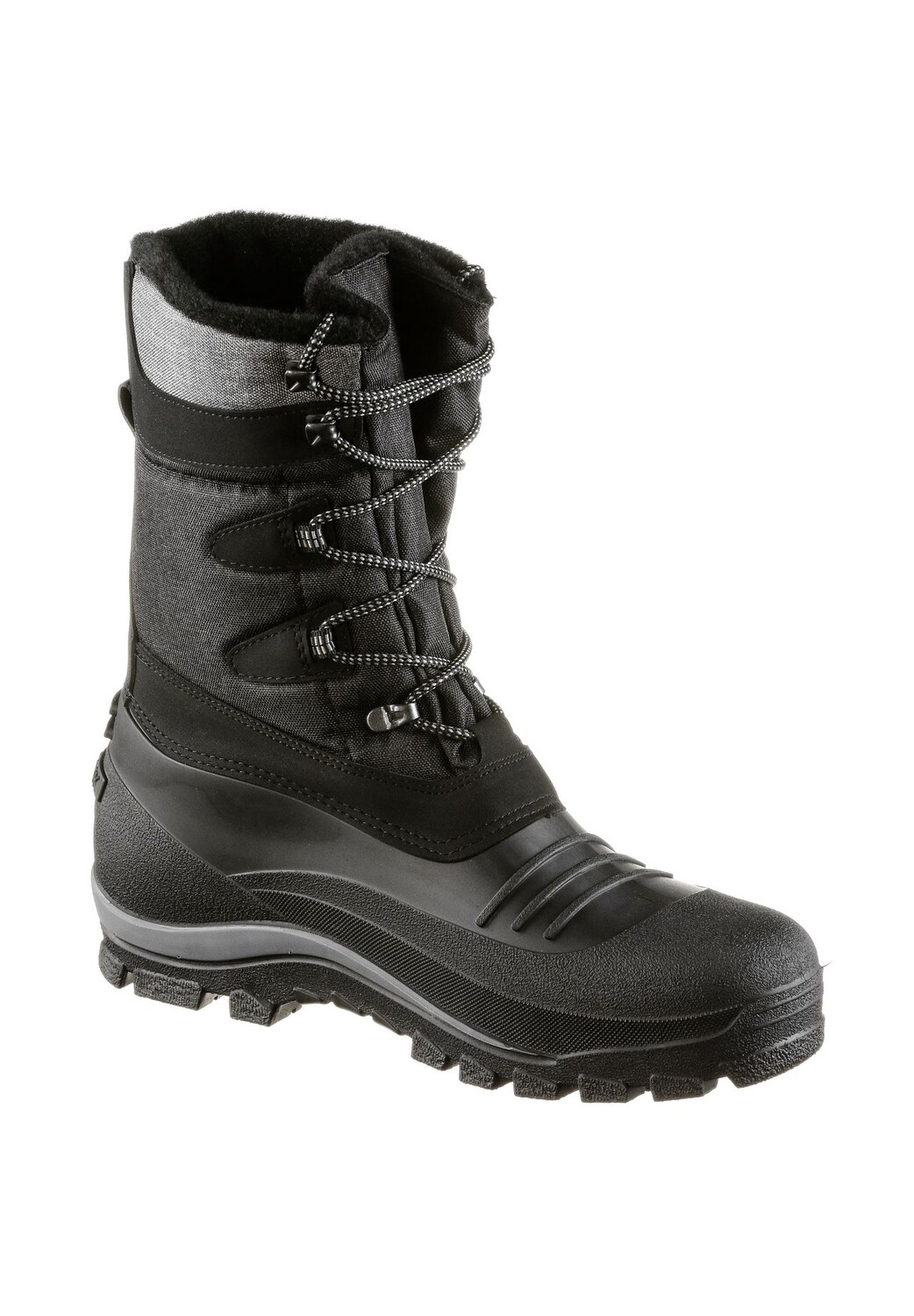 Прочная, высокая зимняя обувь; Область ног изготовлена из прочной твердой резины; Шнуровка с боковыми петлями и металлическими крючками в области голенища для идеальной посадки и повышенного комфорта при ношении; удобный текстильный голенище с водоотталкивающим покрытием; язычок для облегчения надевания и снятия; теплая подкладка из фетра; Верх из текстиля и синтетики; Войлочная стелька; Устойчивая к истиранию цепкая профилированная подошва.