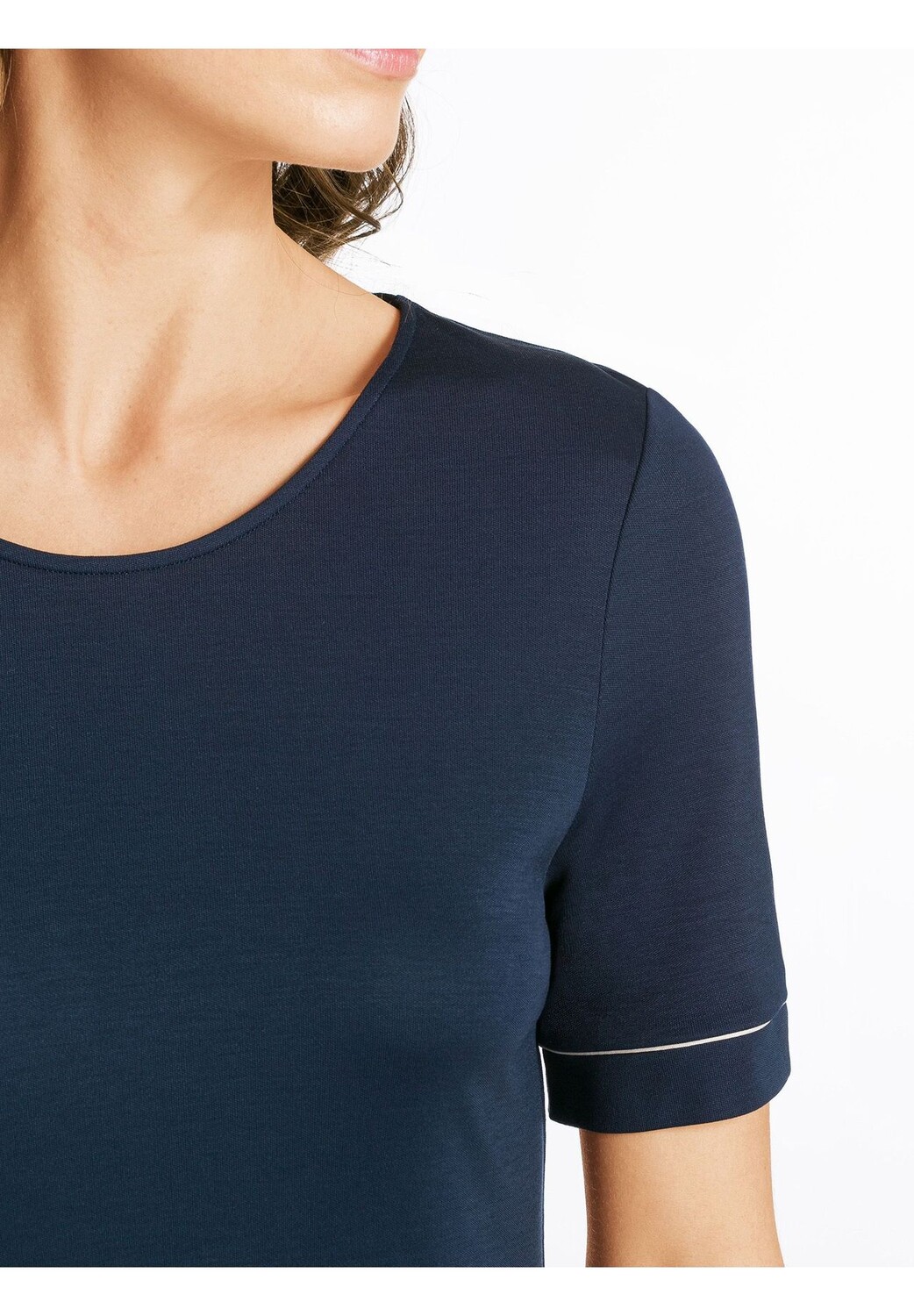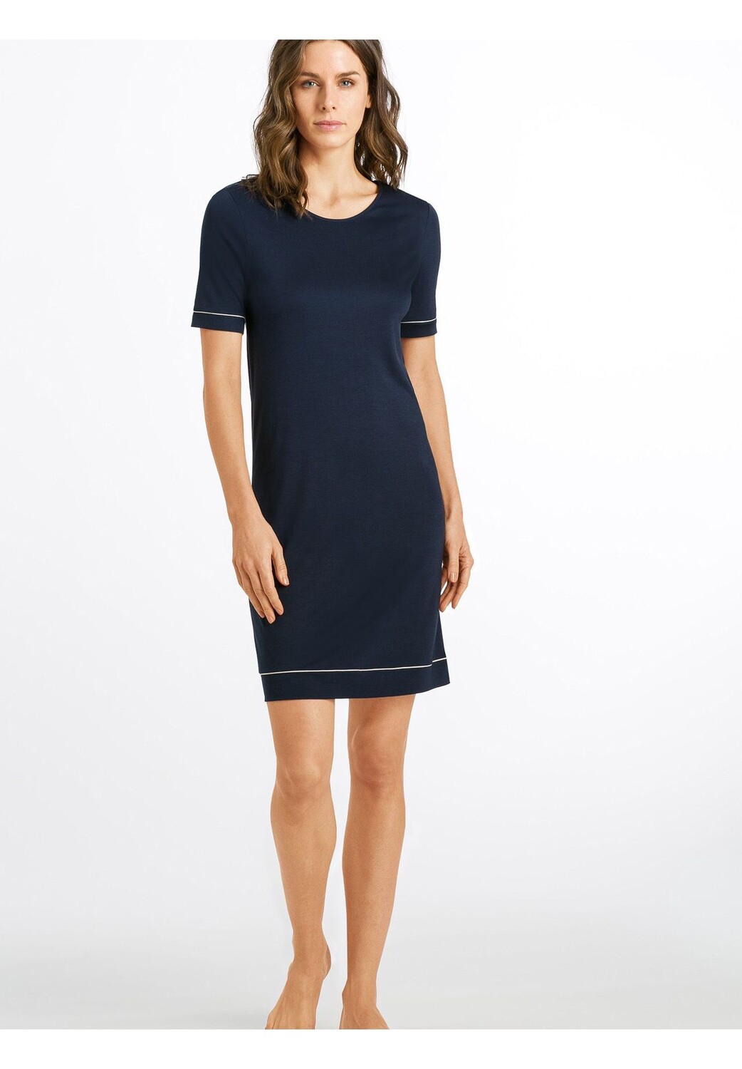 Ночная рубашка HANRO длиной 90 см с короткими рукавами из серии Natural Comfort проста, мягка и идеальна для сна. У него высокий круглый вырез и красивые блики на рукавах и подоле. Ночная рубашка специально изготовлена из экологически чистых волокон и поэтому полностью биоразлагаема и регулирует влажность. Это экологичная роскошь и, следовательно, особенная одежда для сна нового поколения.