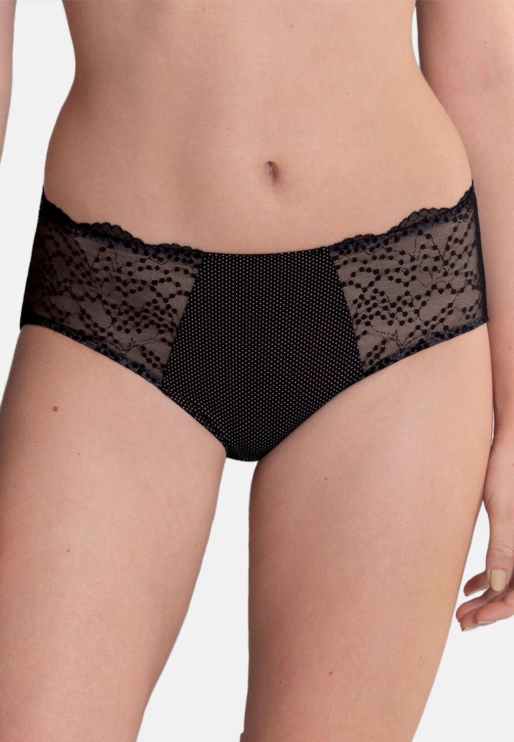 Модные и детализированные трусы Orely на талии очаровывают игривым шармом французского горошка. Нежная вышивка на тюле по бокам придает образу легкость и нотку чувственности.