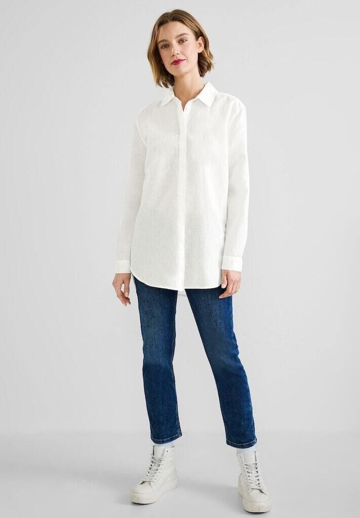 Стильный командный игрок! Повседневная однотонная женская блузка от Street One длинного кроя. С ней ты всегда хорошо одет в офисе. Классические детали, такие как воротник рубашки и планка с пуговицами во всю длину, определяют образ. Комбинация льна и хлопка удобна в носке. БлузкаДлинная форма, смесь льна и хлопка. Планка на пуговицах. Однотонный цвет. Размеры для европейского размера 38. Длина 80 см, обхват груди 111 см, ширина низа 114 см.Материал: 60% лен, 40% хлопок.