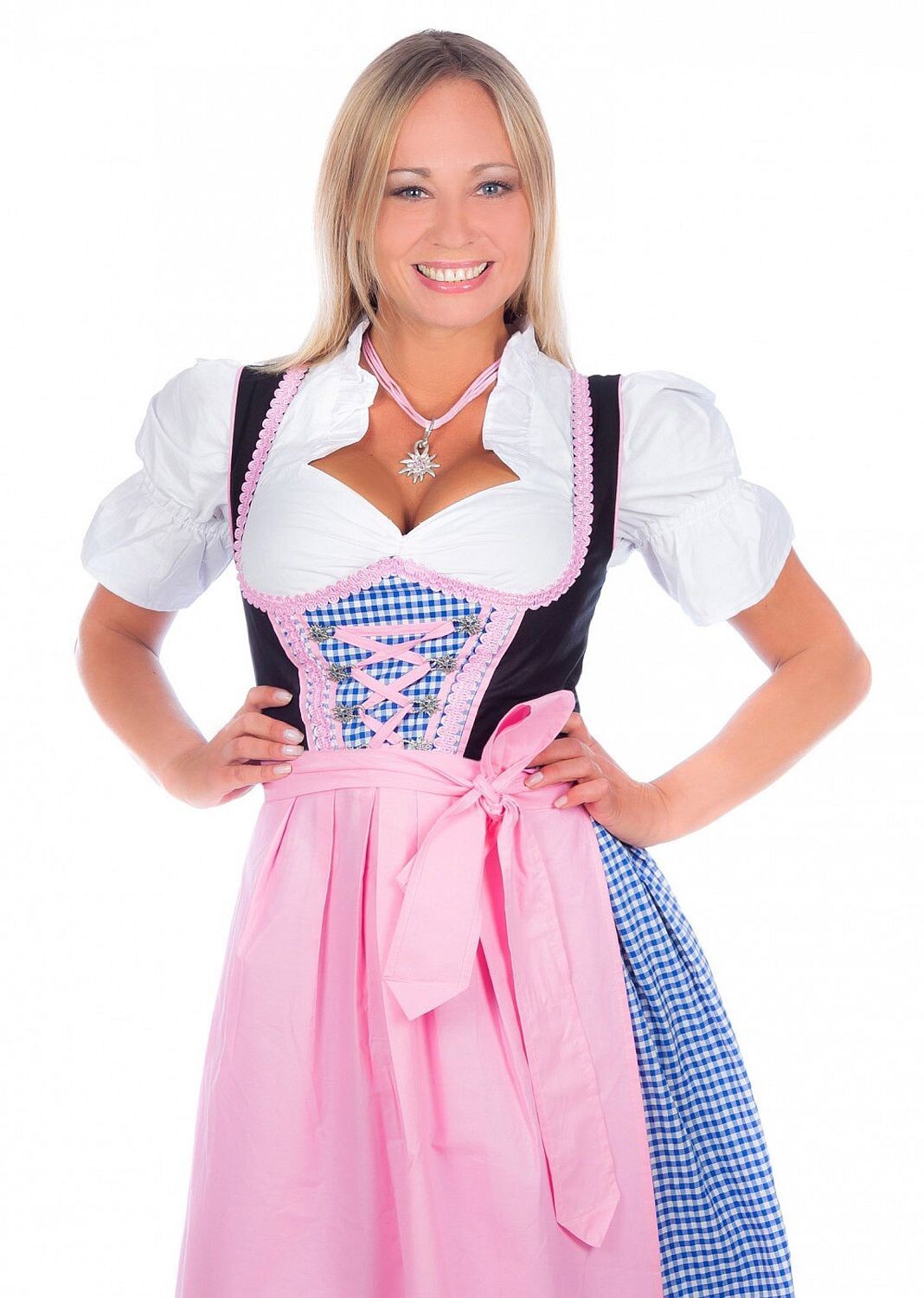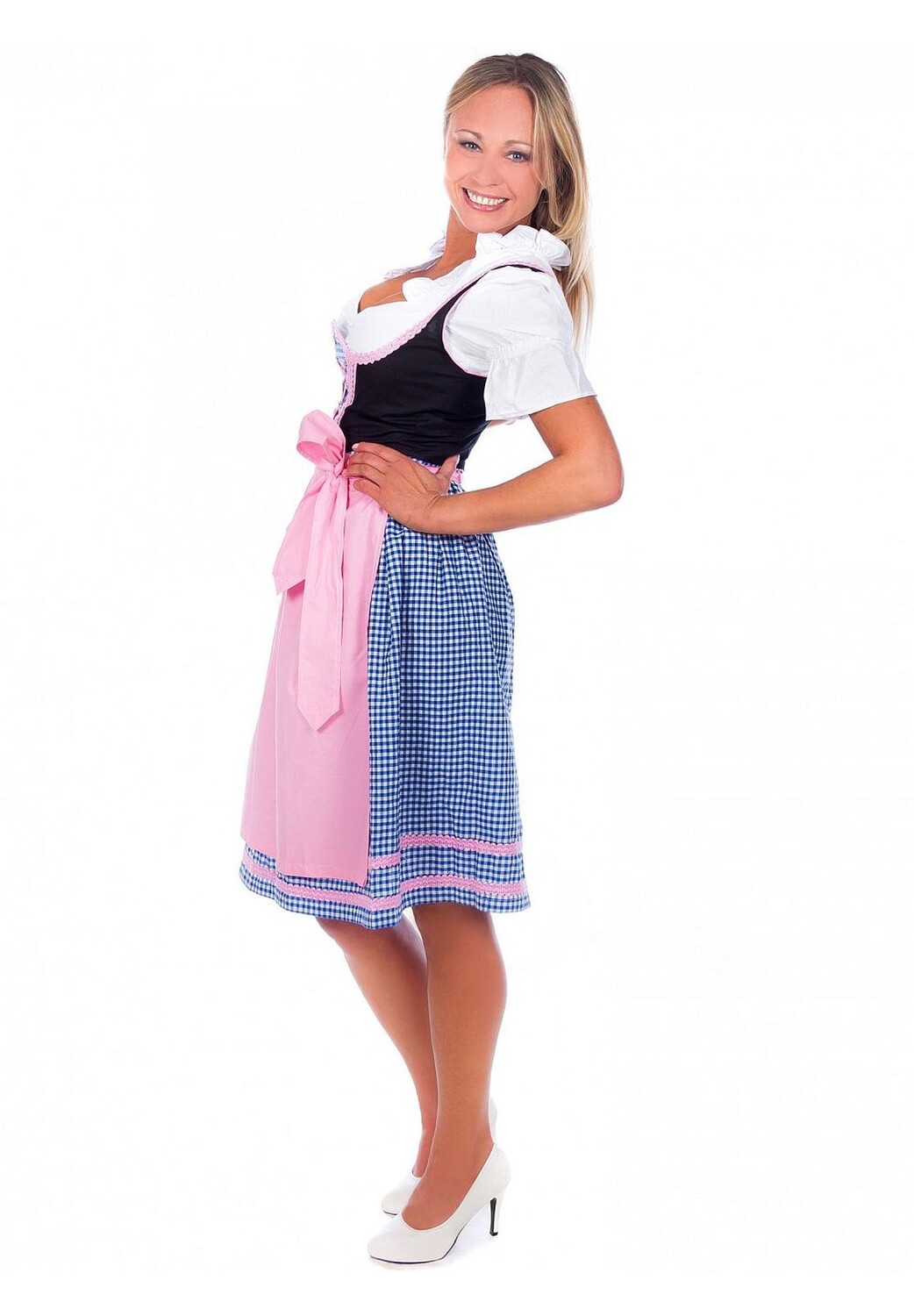 Платье-драйв из трех частей в сине-белую клетку с черным верхом, розовым фартуком в тон и белой блузкой с рюшами. Здесь идеально сочетаются традиции и современность: классический сине-белый клетчатый узор в сочетании с сочетанием синего и розового цветов и нежностью. Бордюр на вырезе делает эту юбку изюминкой нашей коллекции Edelnice.