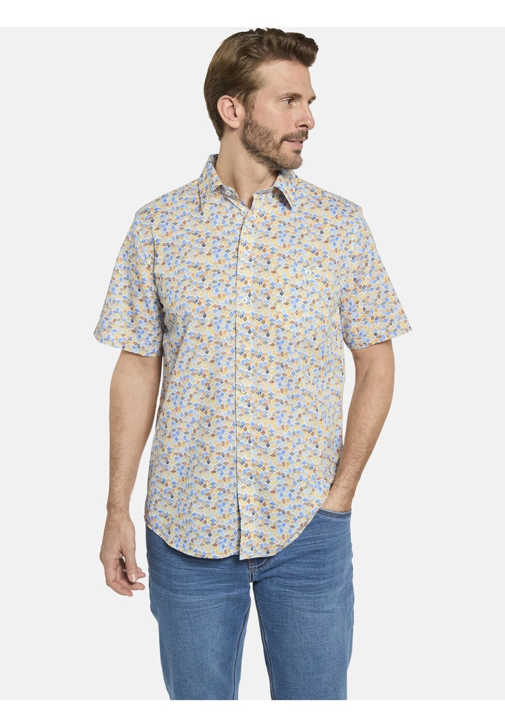 Особенности Стандартная стирка при 40° в деликатном режиме Стирка с похожими цветами , стирать наизнанку, Гладить слева Бежевый узор С нагрудным карманом на пуговице Рубашка с короткими рукавами BELLANZA с узором Классический воротник Нагрудный карман с застежкой на пуговицы Скоординированная игра цвета Идеально подходит для отдыха Стиль: Повседневный Примечание о размере: Вещь обычная Форма воротника