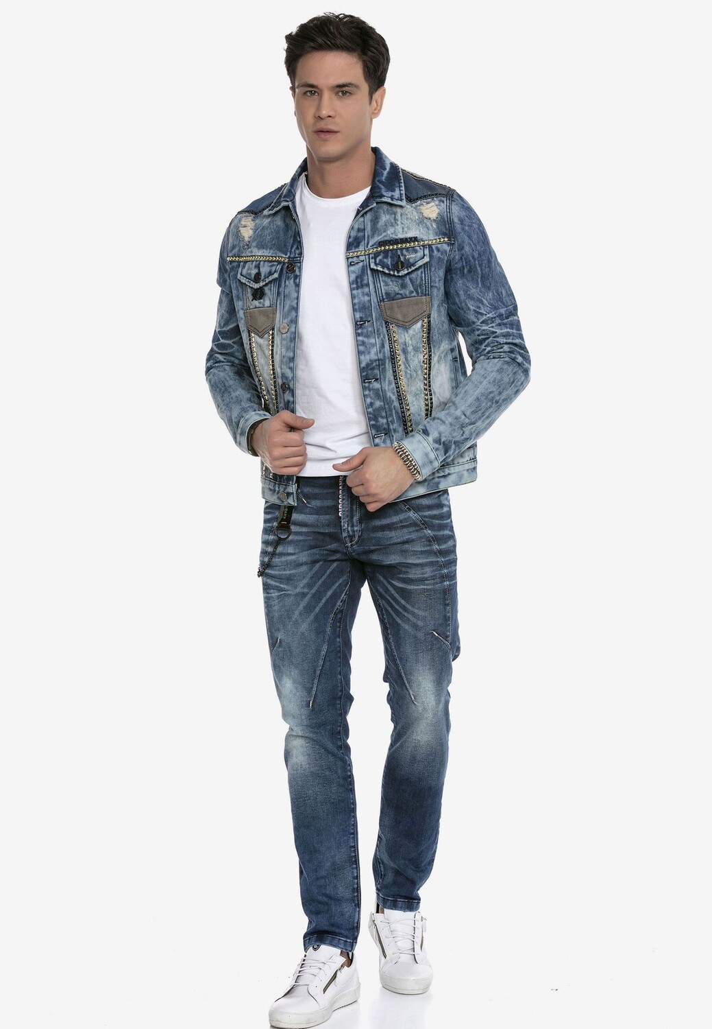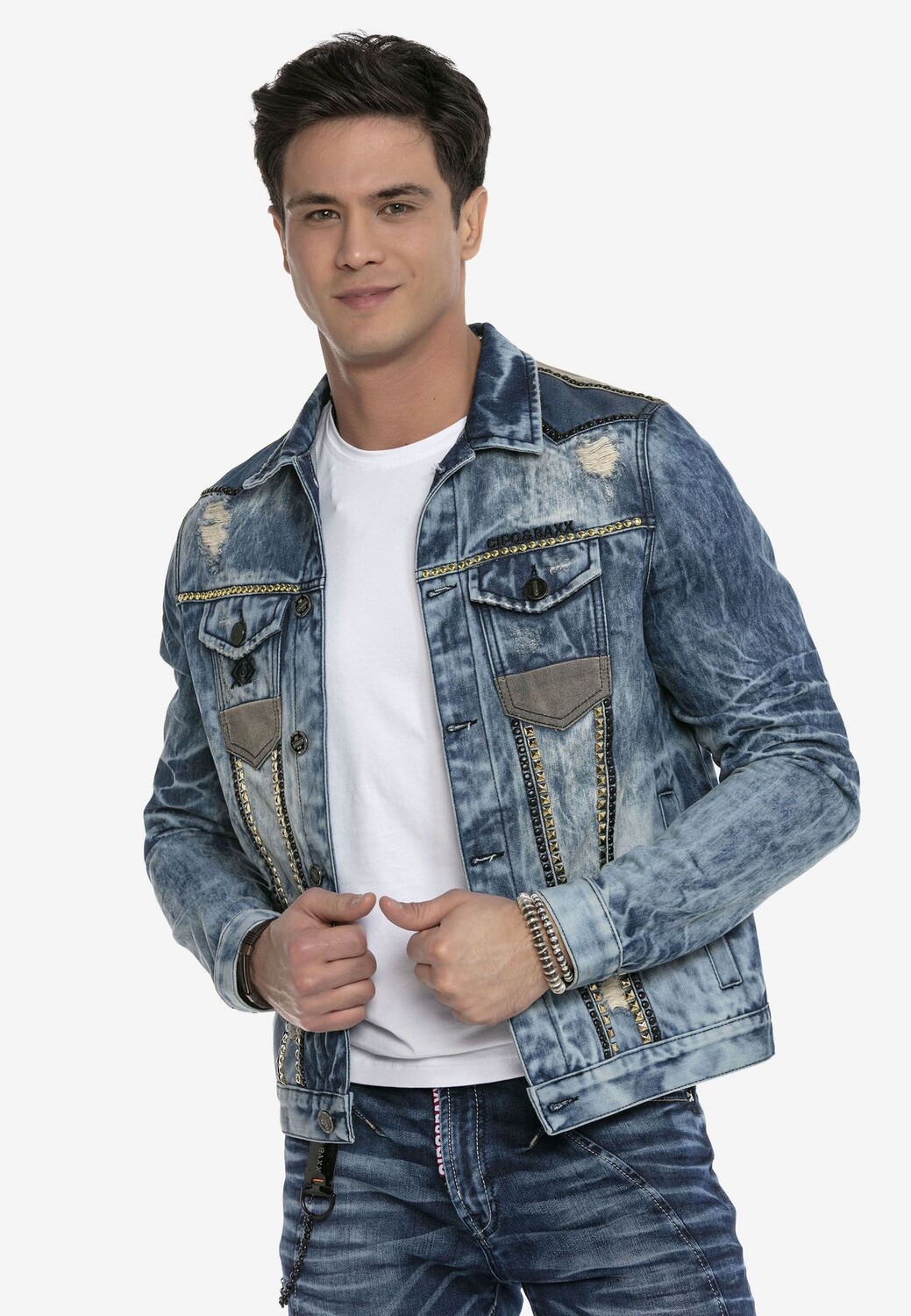 Особенности Стильная мужская джинсовая куртка от Cipo & Baxx Изготовлена из чистого, высококачественный хлопок Сделано Привлекает внимание благодаря заклепкам Большой комфорт при ношении благодаря удобной посадке Можно комбинировать разными способами для создания смелых образов Стиль: Спортивный Примечание о размере: Нормальный вариант Длина рукава: Длинный рукав Передние, задние, внутренние карманы: Нагрудный(ые) карман(ы), боковой(ие) карман(ы)