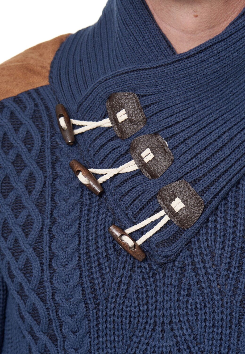 ОсобенностиМодный мужской свитер от Rusty Neal Полиакрил и хлопок очень удобны в ношении Теплый шалевый воротник с пуговицами Двухцветный дизайн, украшенный элегантным вязаным узором Универсальный must-have для холодных дней осенью и зимой