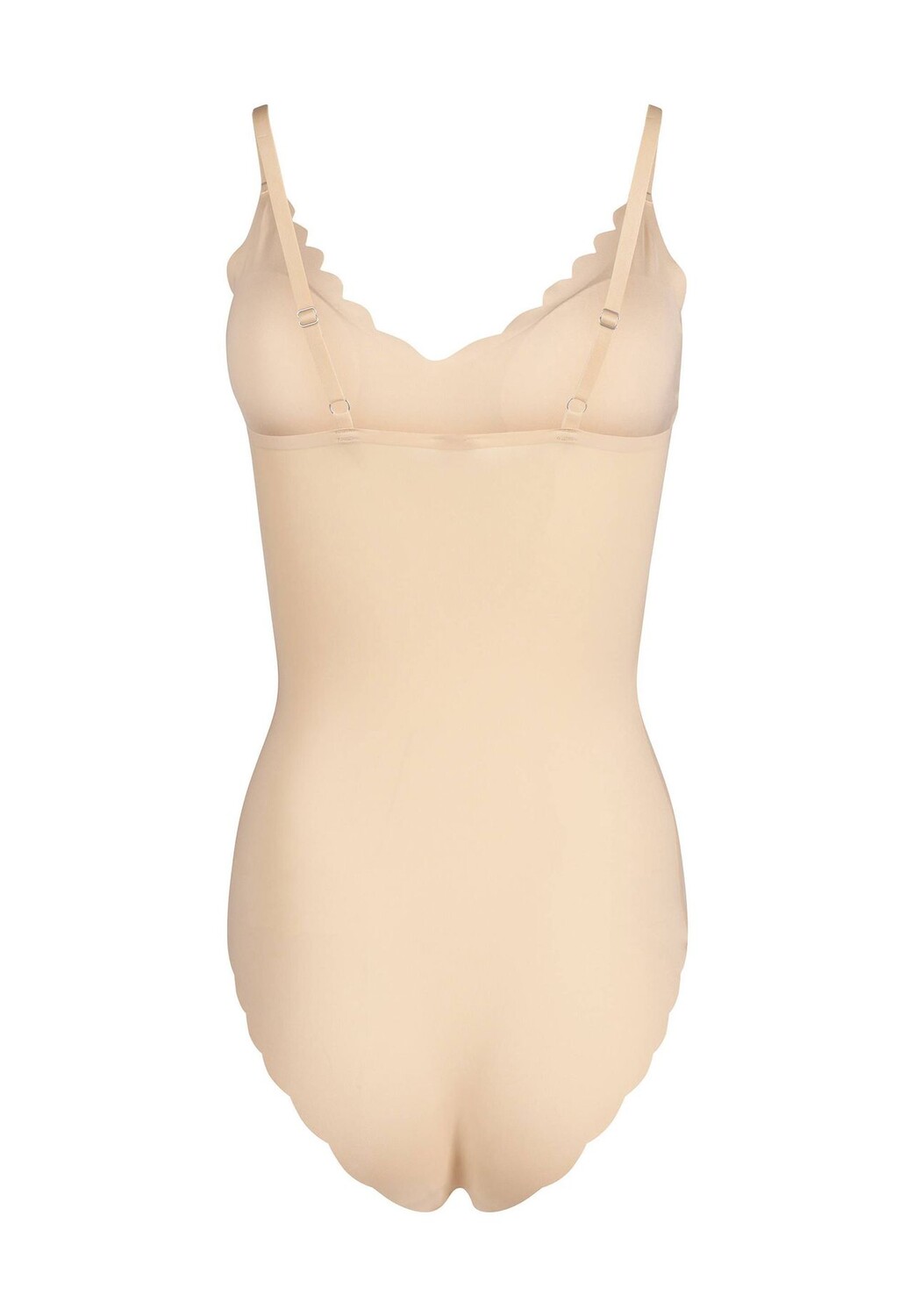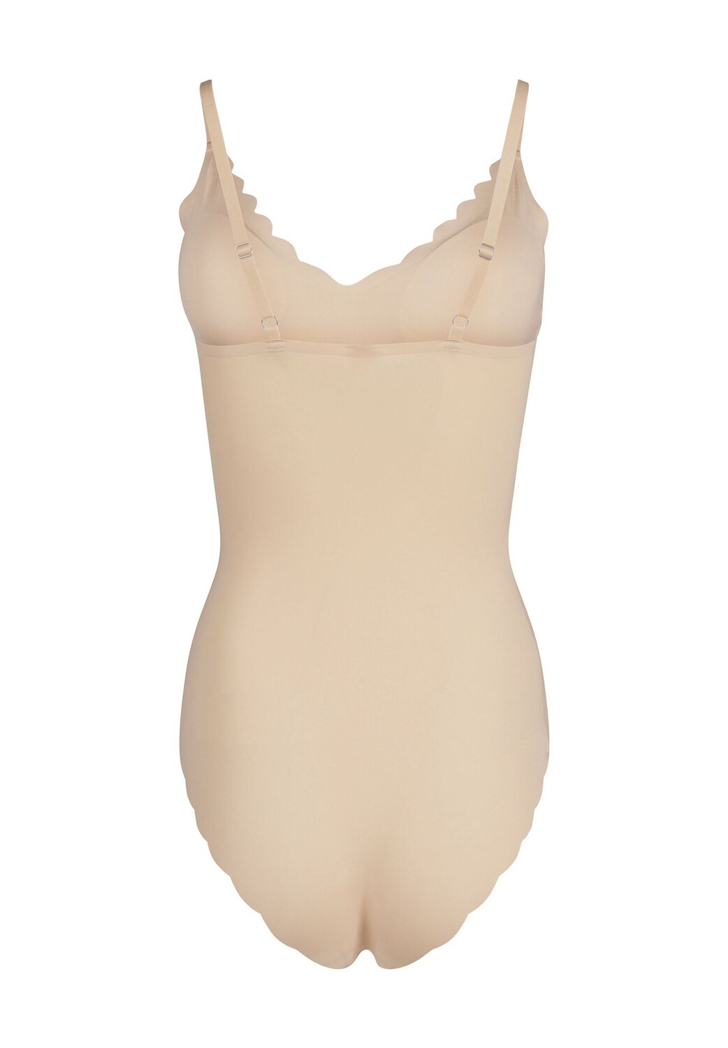 Это боди без рукавов из мягкой микрофибры с тонкими бретельками доказывает, что красивое нижнее белье не обязательно прятать. Красивый верх с V-образным вырезом и декоративным фестончатым краем подчеркивает зону декольте, а низ служит удобными трусиками с невидимым эффектом.