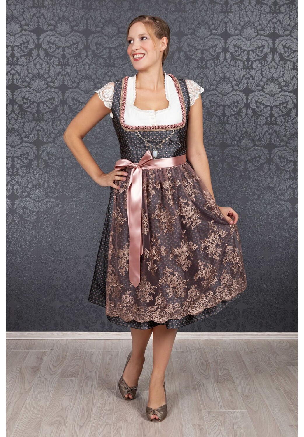 Чтобы создать элегантный традиционный и в то же время современный образ, вырез был сохранен очень прямым, а шнуровка из атласной ленты намеренно опущена. Это означает, что элегантная парчовая ткань и медальон Шаривари могут быть показаны с максимальной выгодой, не создавая при этом перегруженного вида. Удобная парчовая ткань неподвластного времени темно-серого цвета украшена разбросанным цветочным узором старого розового цвета. Вырез украшен двумя каймами: каймой из золотисто-бежевого цвета и тонкой традиционной баварской каймой «лягушачий рот» из розового атласа. Элегантный кружевной фартук-дирндль розово-бежевого цвета идеально сочетается с этим. Шнуровка атласной лентой выполнена в том же цвете, что и отделка лягушачьего рта, поэтому выглядит особенно элегантно и гармонично. Шаривари крепится с помощью карабинов, поэтому его также можно снять.