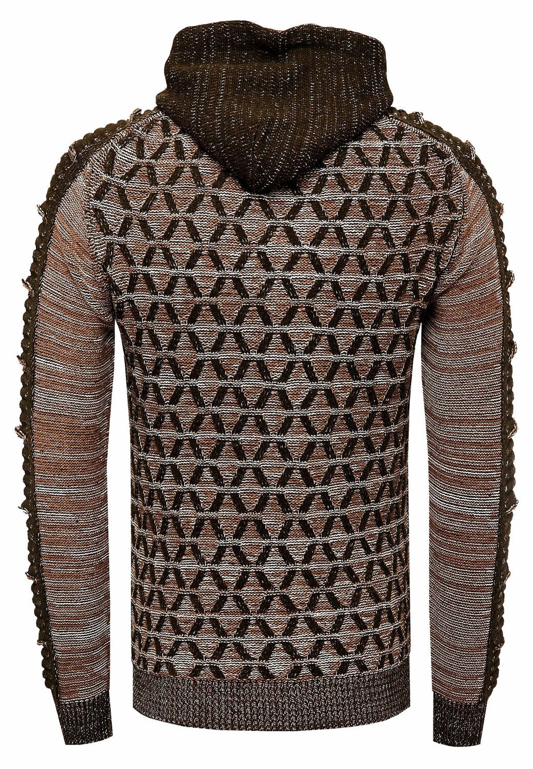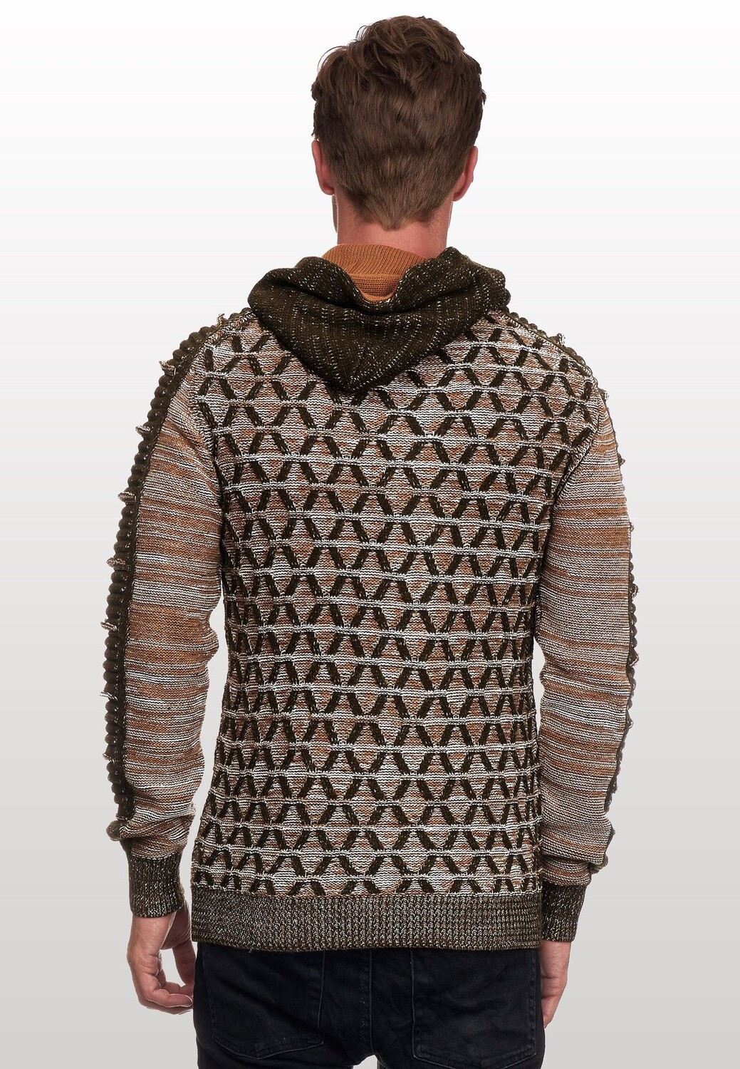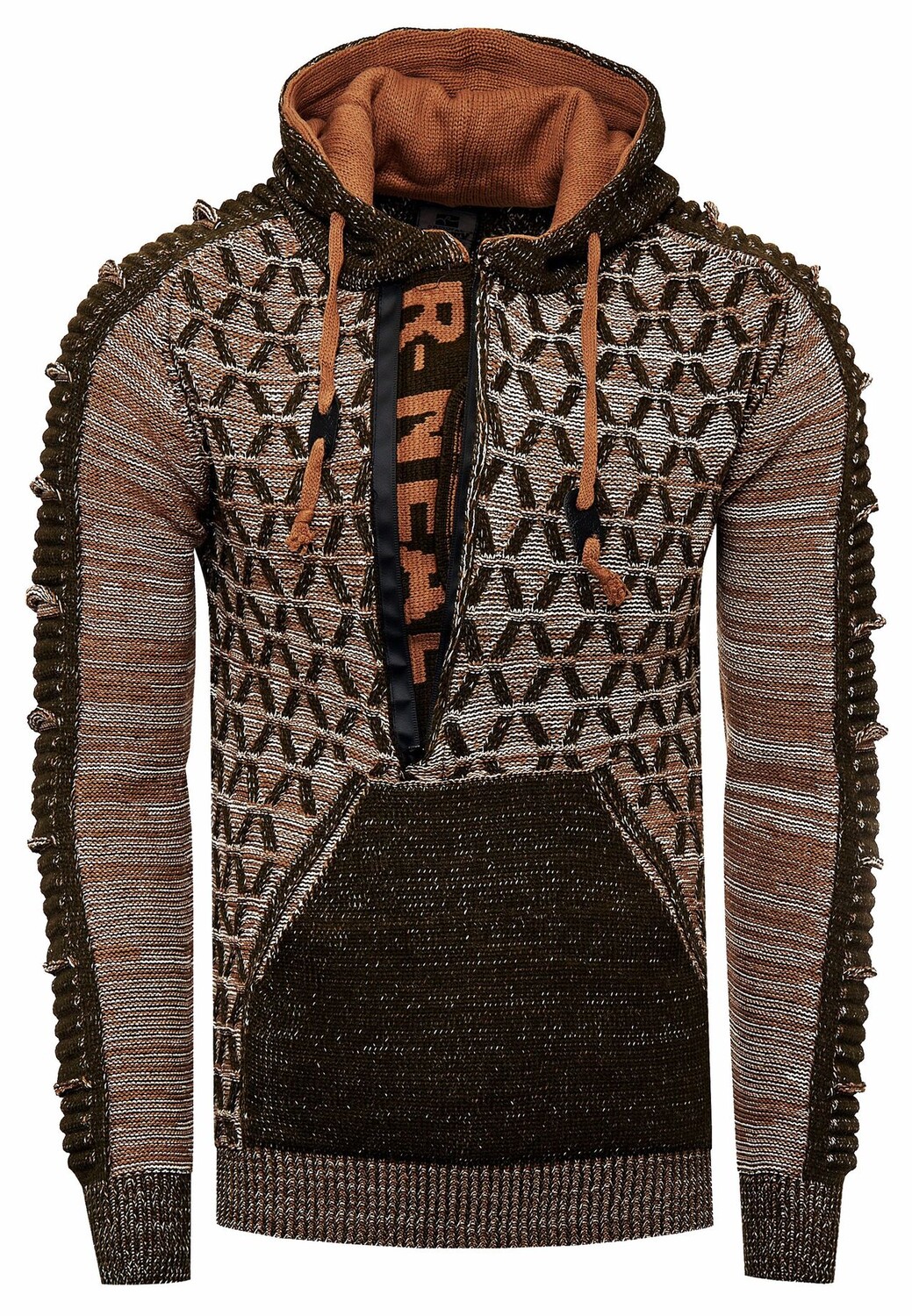 Особенности Необычный вязаный мужской свитер от Rusty Neal С Карман-кенгуру контрастного цвета Прикольное сочетание различных узоров Капюшон на шнурке сохраняет тепло