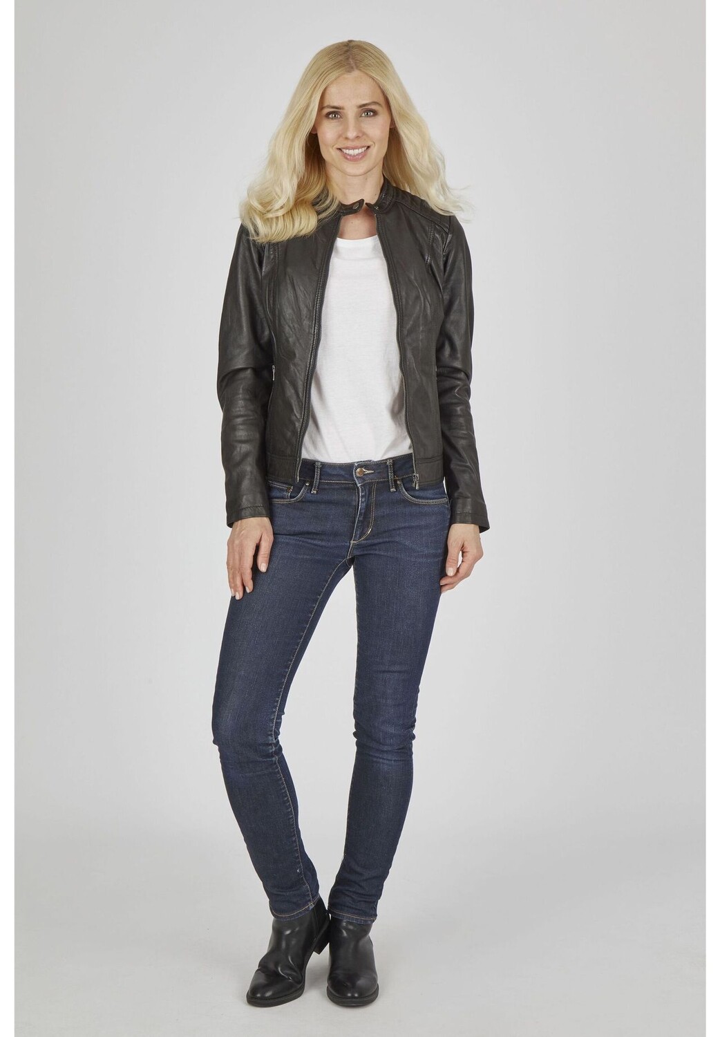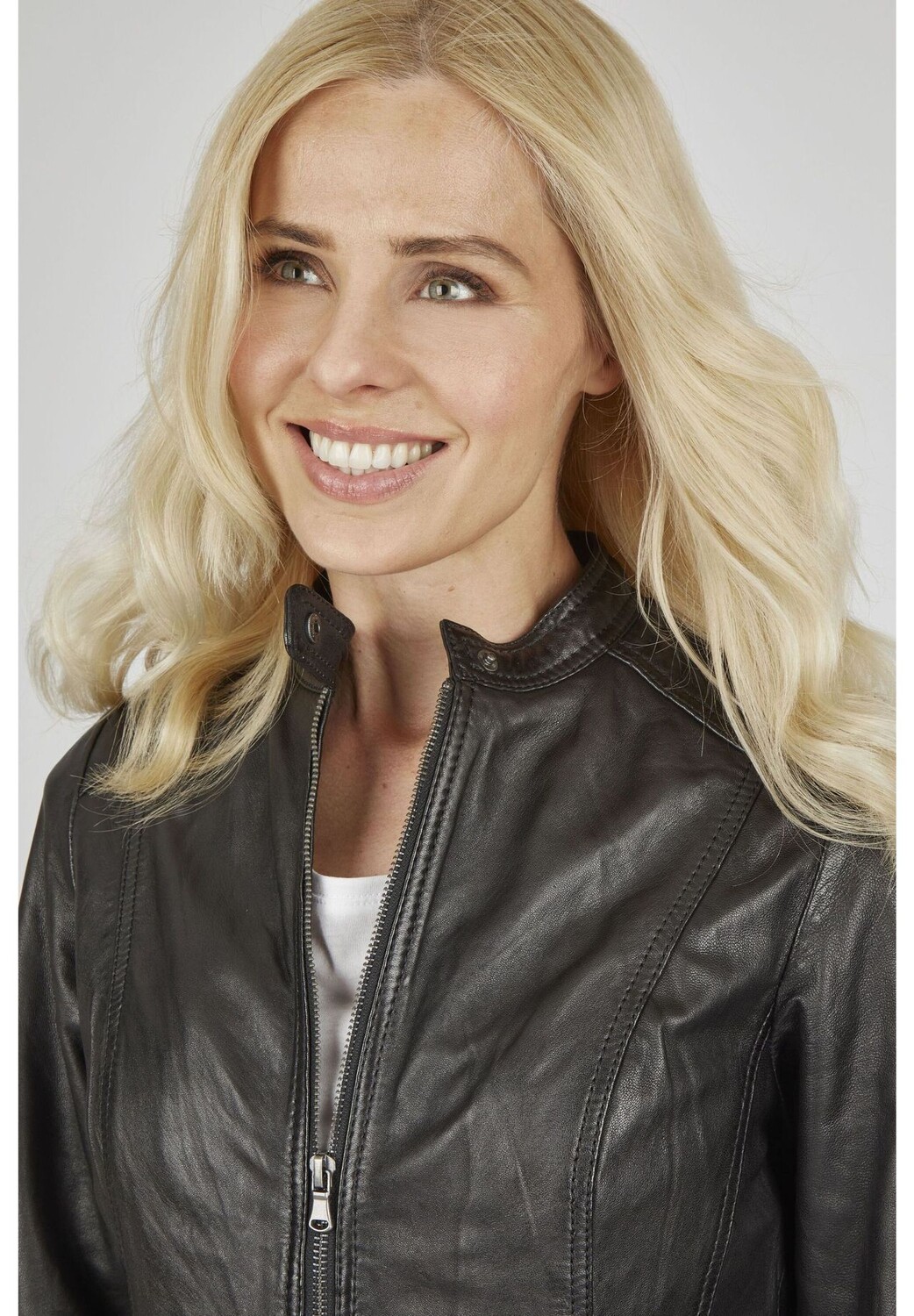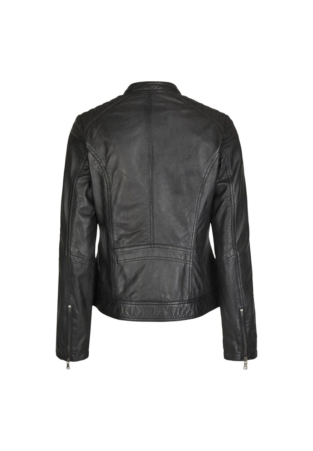 Эта модная кожаная куртка от 7ELEVEN изготовлена ​​из высококачественной кожи ягненка наппа растительного дубления. Облегающие швы и слегка приталенный крой гарантируют, что эта модель будет удобно сидеть и подчеркивать фигуру. Стеганая ткань на плечах, карманы на молнии и воротник-стойка с кнопками добавляют спортивный и повседневный акцент.