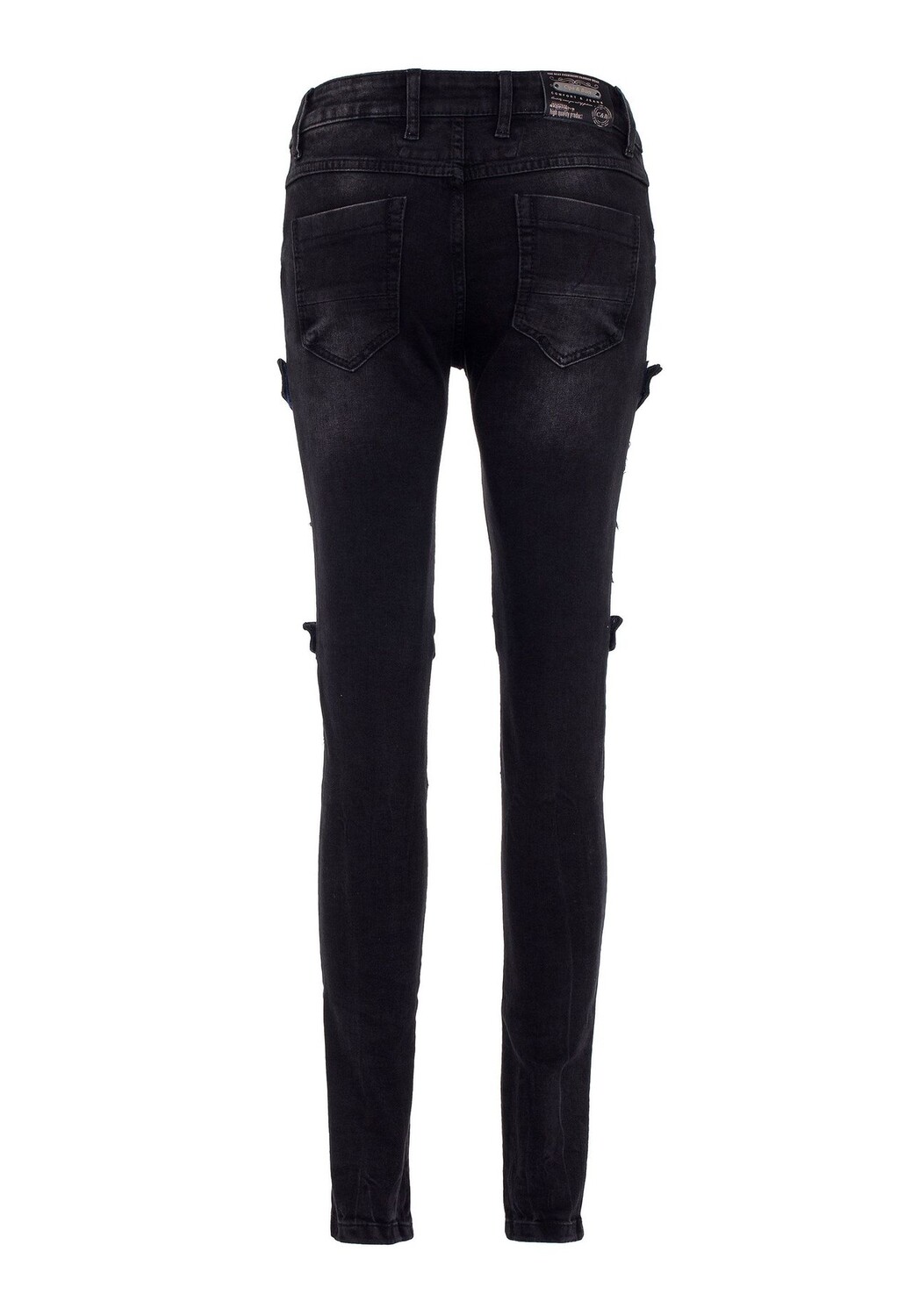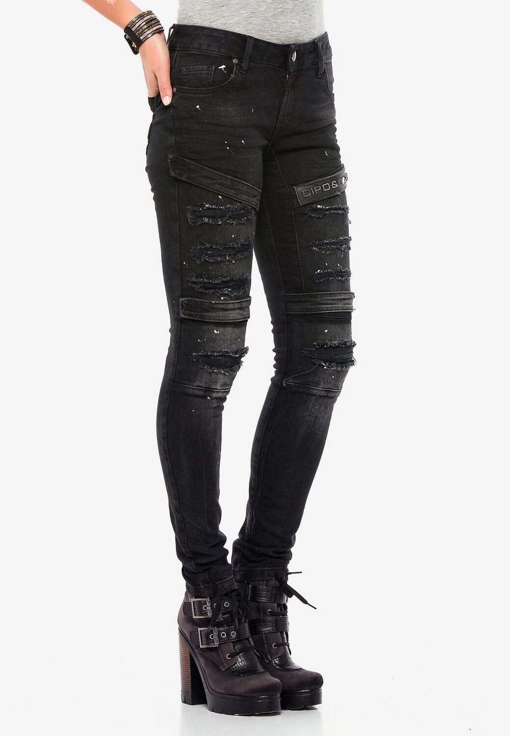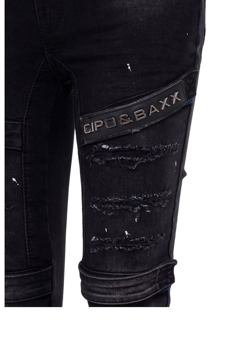 Эти брюки от Cipo & Baxx имеют зауженный крой и стильный байкерский вид. Джинсовая ткань украшена контрастными брызгами краски, потертостями, бахромой и разрушенными деталями. Брюки также впечатляют четырьмя прикрепленными лямками с застежками-липучками, брендингом, дизайнерскими заклепками на пуговицах, застежкой на пуговицу, классической формой с пятью карманами и формирующими байкерскими швами в промежности, на бедрах и на коленях. Эмблема Cipo & Baxx искусно дополняет внешний вид.