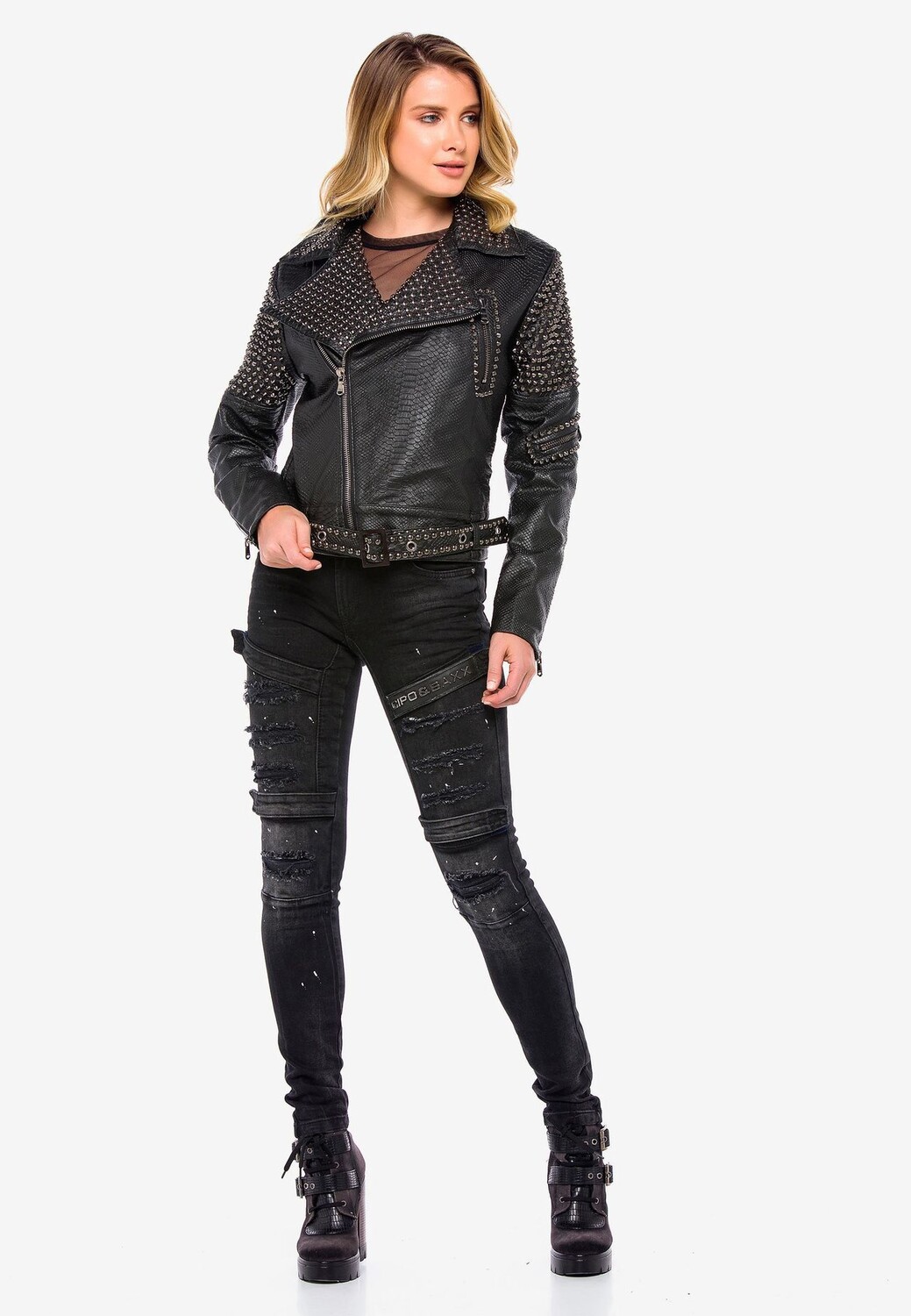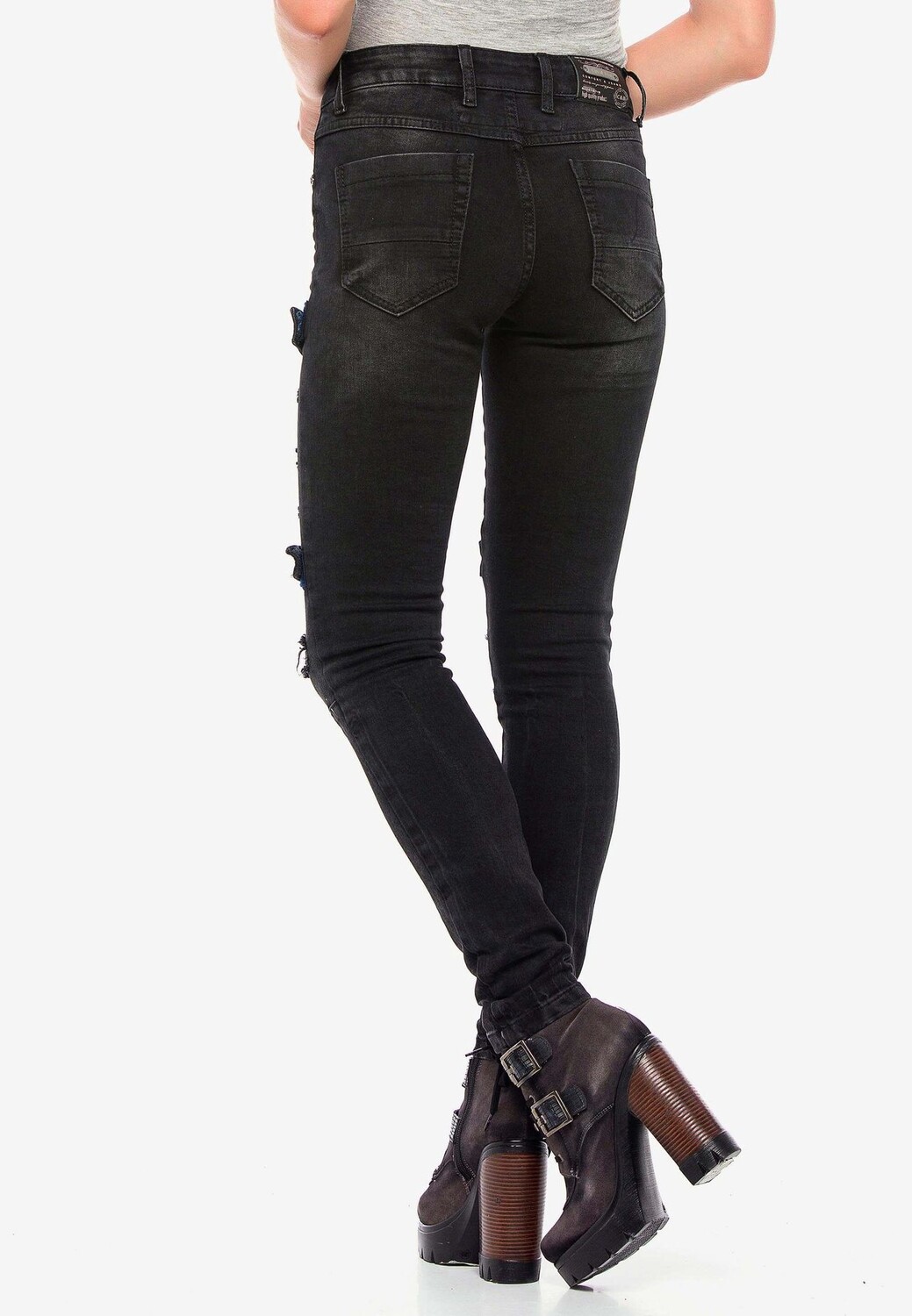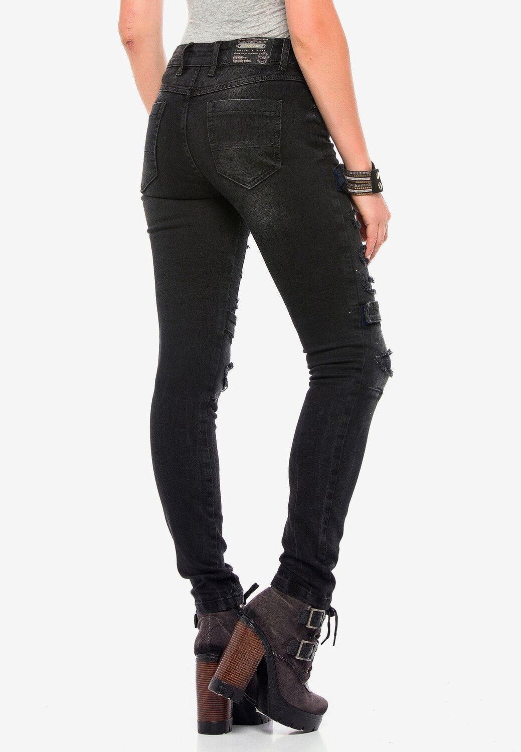 Эти брюки от Cipo & Baxx имеют зауженный крой и стильный байкерский вид. Джинсовая ткань украшена контрастными брызгами краски, потертостями, бахромой и разрушенными деталями. Брюки также впечатляют четырьмя прикрепленными лямками с застежками-липучками, брендингом, дизайнерскими заклепками на пуговицах, застежкой на пуговицу, классической формой с пятью карманами и формирующими байкерскими швами в промежности, на бедрах и на коленях. Эмблема Cipo & Baxx искусно дополняет внешний вид.